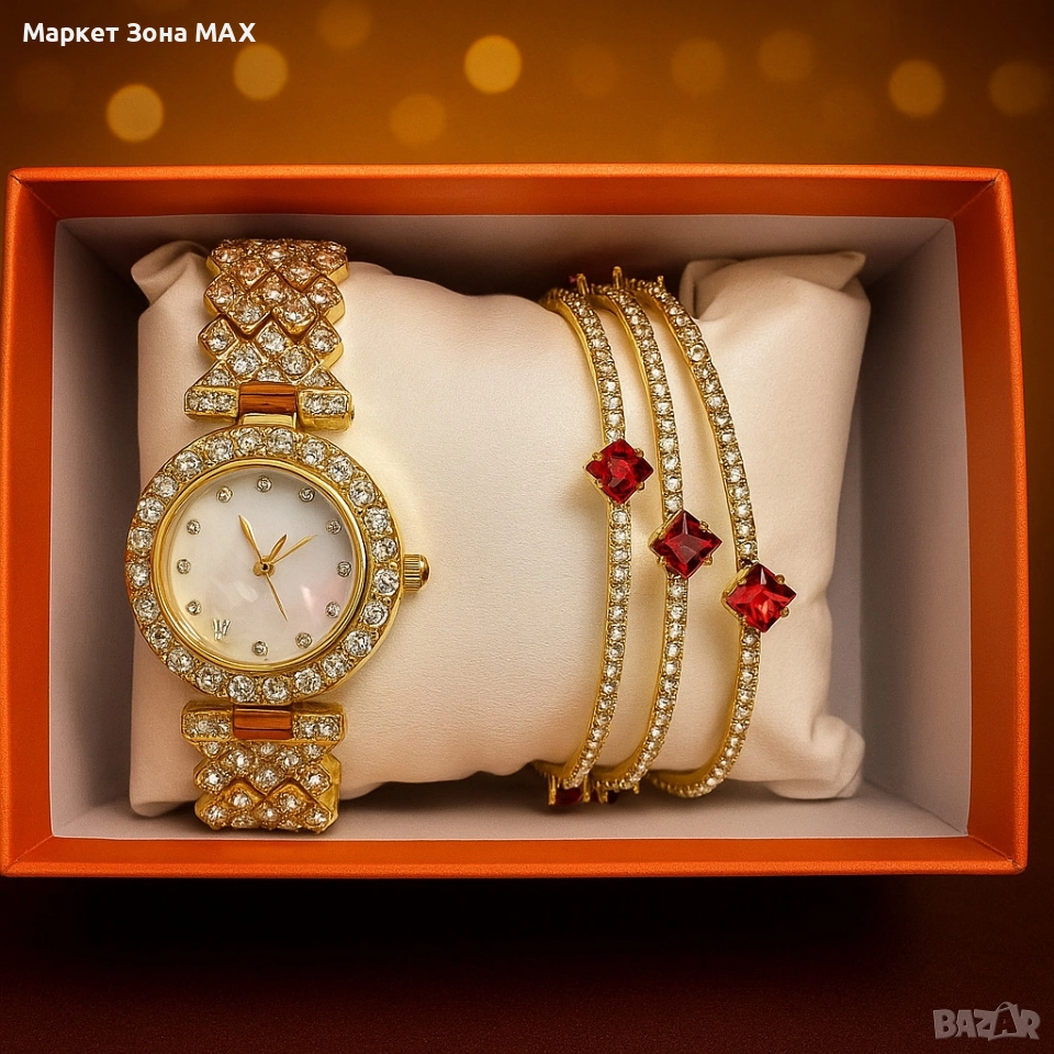 Готов сет за елегантност: кварцов часовник + 3 гривни с червени акценти