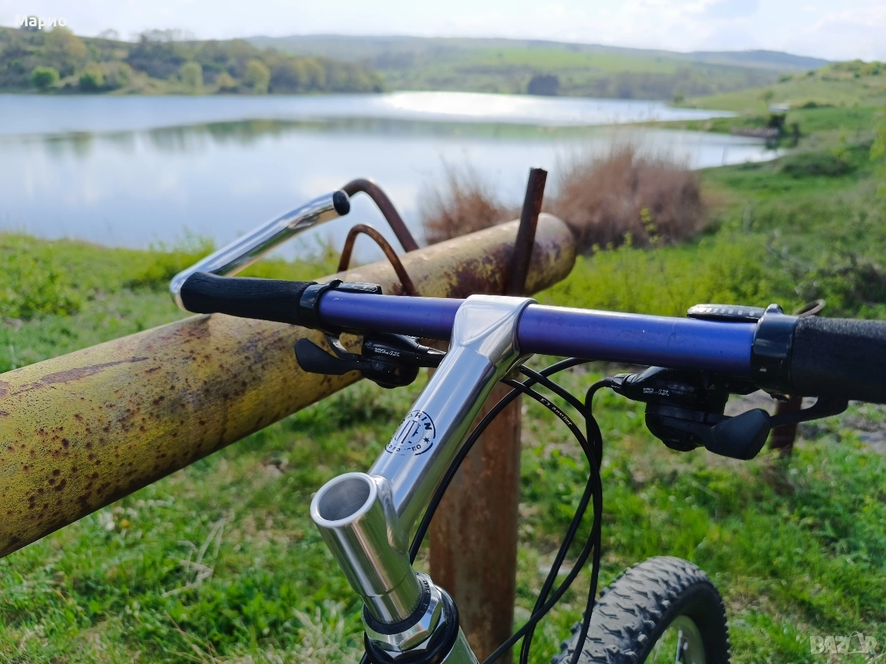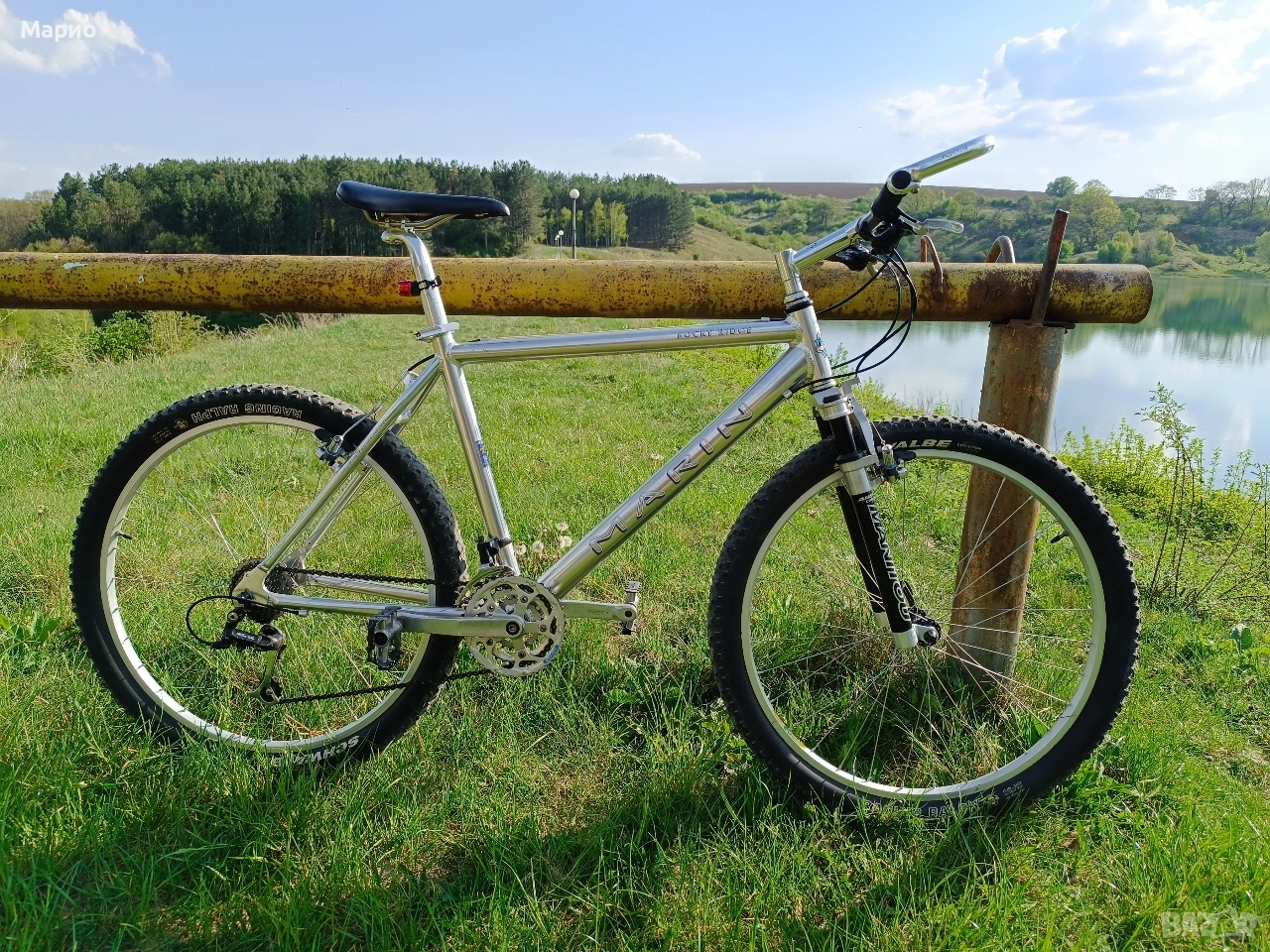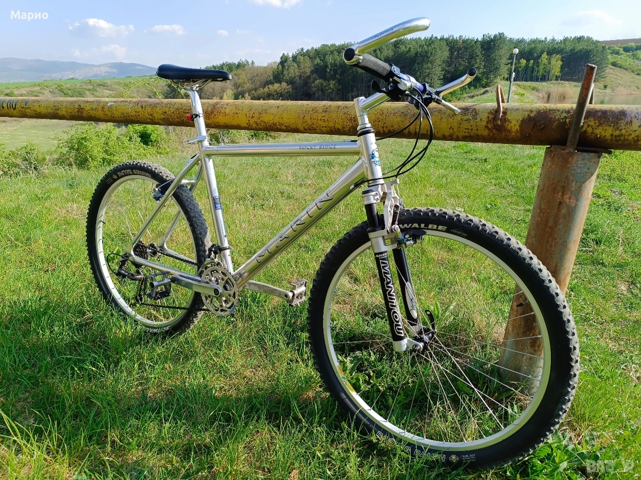 Manitou Answer. Размера на рмаката е L( като за човек 175-185см), алуминия на рамката, кормилото, колчето и лапата е 7000, което ще рече че е супер лек. Монтажа е Shimano LX 3x8, каплите са Mavic (идеално прави), а главините Paralax(със страхотна инерция и без никакви шумове и луфтиве). Всичко изброено е в страхотно здраве и работи безупречно, като главините са минали профилактика скоро. Всички компоненти по колелото (с изключение на монтажа) са правени по поръчка на марката и това е обозначено навсякъде. Теглото на велосипеда е 10.5кг без кошници за бидони и педали, което си е супер дори и по модерните стандарти! Продава се без сините педали на снимките (мога да сложа други, за да се подкара веднага). Колелото няма боя, полиран алуминий с лак върху стикерите и метала е. Все пак е 94-та година и съответно има забележки по лака, но цялостно колелото е в супер състояние, вилката работи супер въпреки възрастта си и е много лека. Ородавам го, заради друг приект и то с тежест в сърцето, защото такива се намират трудно, надявам се да го вземе ценител! Намира се в Перник. За повече информация тел. 0893965925