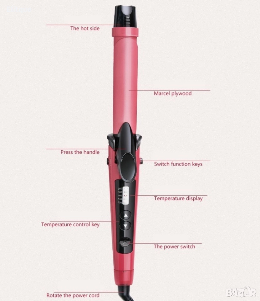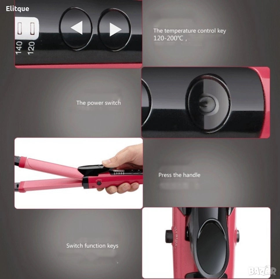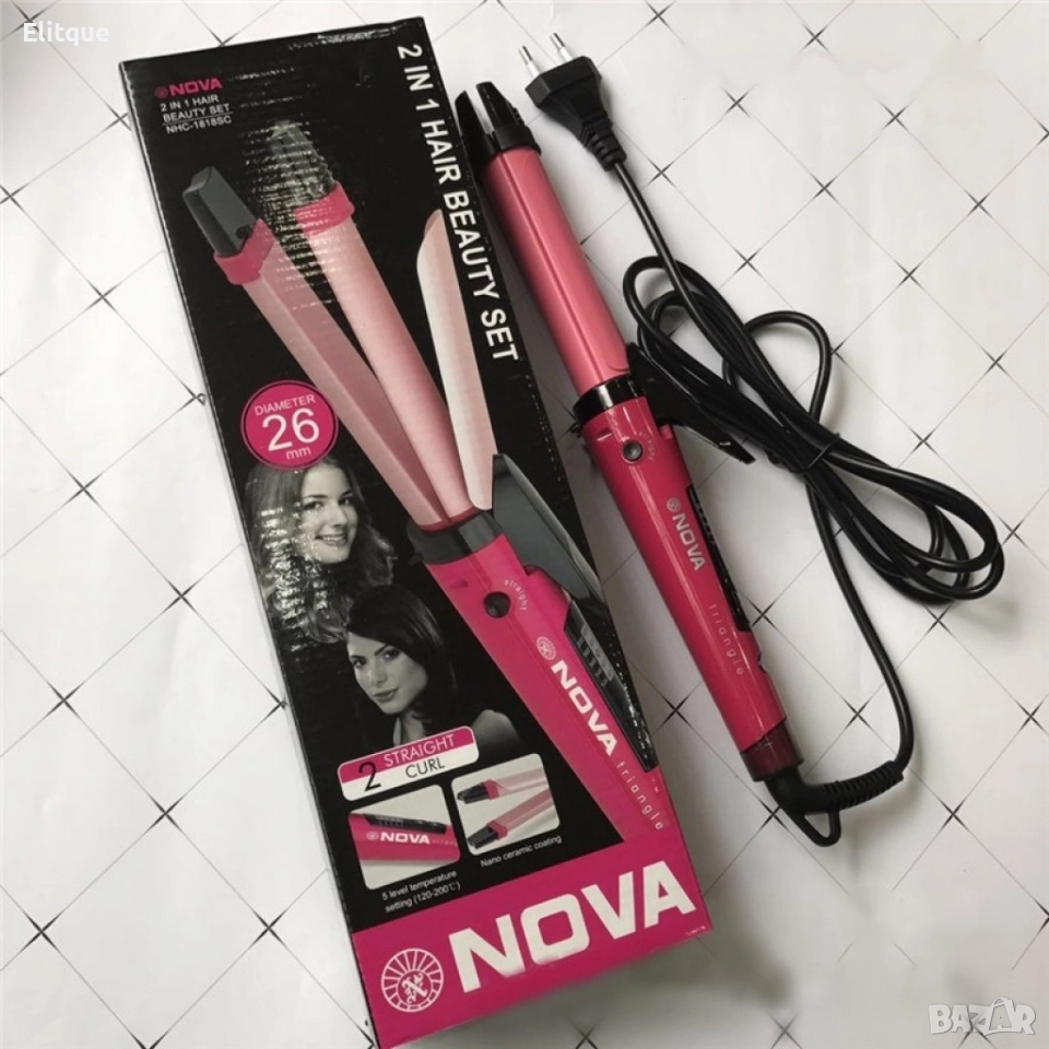 Технически характеристики: Може да прави малки и големи къдрици; Функция Еasy lock – Да; Калъф – Не; Цвят – Розов; Плочата е направена от нано керамика; 35 см дължина; Диаметър на плочата 2,6 см; 5 нива на гореща температура (120-200 градуса C); Бутон ВКЛ / ИЗКЛ; Кабелът може да се върти до 360 градуса; Технология за защита на цвета на косата, перфектно защитава цвета на косата, дори когато често се изправя; Мощност 45 вата; 220-240v; 50 / 60Hz. Многофункционалната маша за коса е 1 инструмент с 2 функции. Nova 2 в 1 може да изправи вашата коса и едновременно с това да я накъдри на нежни и вълнообразни къдрици. Удобният инструмент е идеален за всяка дама. Изработен е от 100 % розова керамика. Оборудван е с цифров контрол на температурата с нива от 1 до 5 и 45 вата мощност. Кабелът е много удобен и може да се завърти на 360 градуса.