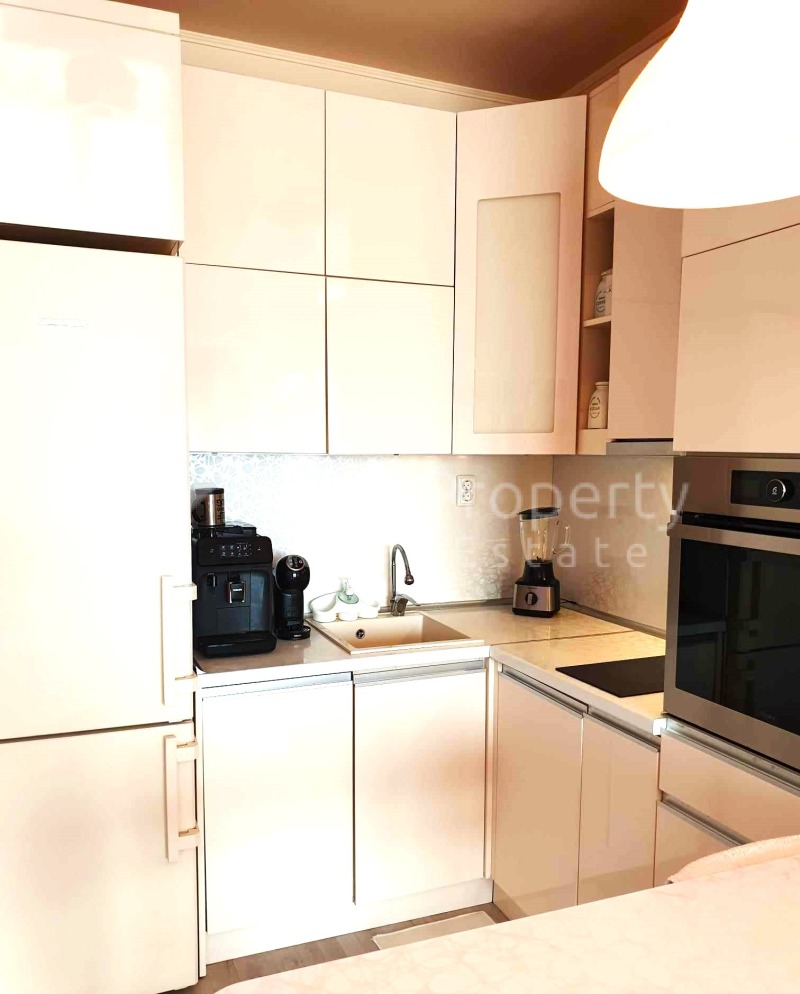 Апартаментът е напълно обзаведен и е с площ 71 кв. м., от които чиста площ 60 кв. м. Разполага с голяма панорамна тераса ориентирана в посока запад, югозапад, предлагаща наслада от прекрасни залези и панорама към Бургаското езеро. Кухнята е оборудвана с уреди от висок клас голям хладилник, фурна, котлони, абсорбатор, миялна и микровълнова. Всяка стая разполага с мощен климатик, а топлата вода е от бойлер. Апартаментът се продава с всичките мебели и оборудване видни на снимките. Месечните такси за поддръжка са в размер около 60 лв.