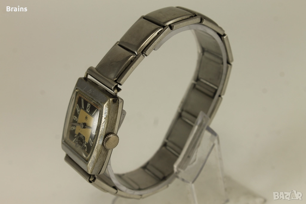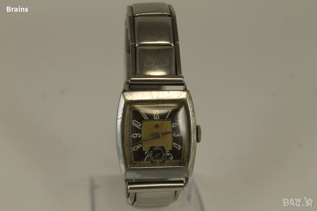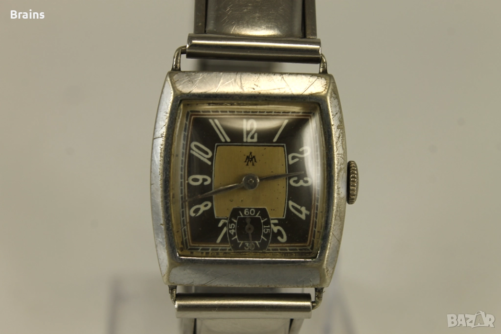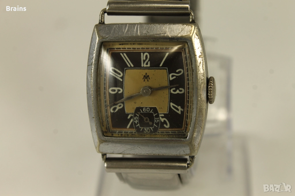 Оригинален Немски военен часовник AM от 1930-те години. Каса във формата на танк. Метален циферблат във черно и жълто, доста запазен за годините си. Оригинална Немска стоманена разтеглателна верижка - SP. Качествен механизъм със 15 рубина. Часовника работи точно, навива и сверява нормално.
