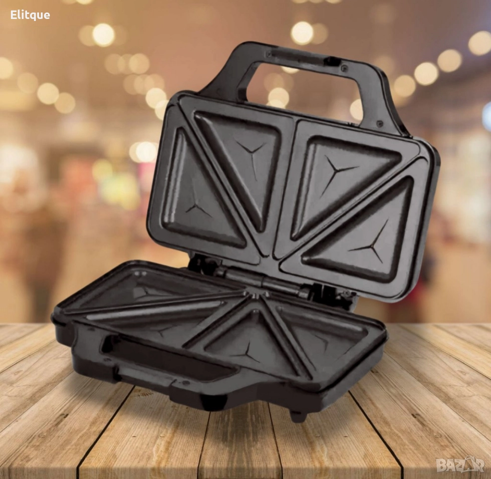 Тип продукт: Машина за сандвичи; Вид нагревателна повърхност: Сандвич панели; Мощност: 1000W; Брой отделения: 4; Материал на корпуса: Неръждаема стомана; Покритие на работната повърхност: Незалепващо; Индикатор за работа: Да; Ненагряваща се дръжка: Да.