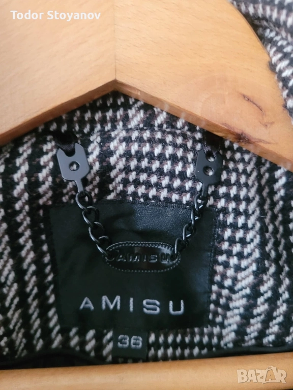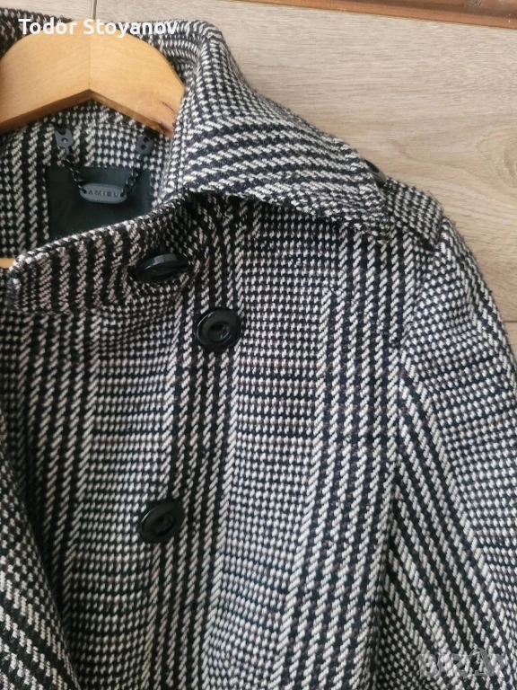 Разкошен модел зимно палто AMISU. Всеки детайли е професионално изпипан! Асиметрично закопчаване копчета, два странични джоба, коланче в талията. Шест редови копчета при ръкавите. Отзад е плесирано в ханша, което го прави още по шик! Материята вълна и акрил. Хастара има допълнителна вата, което го прави още по-топло. Размер по етикет 36 ( S). Подходящо и за М. Гръдна 92- 94см, дължина 83см. Още снимки в коментар.