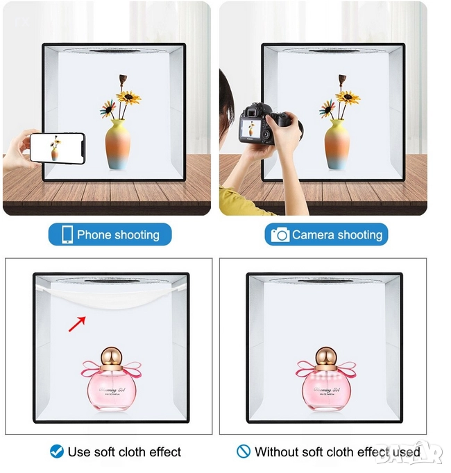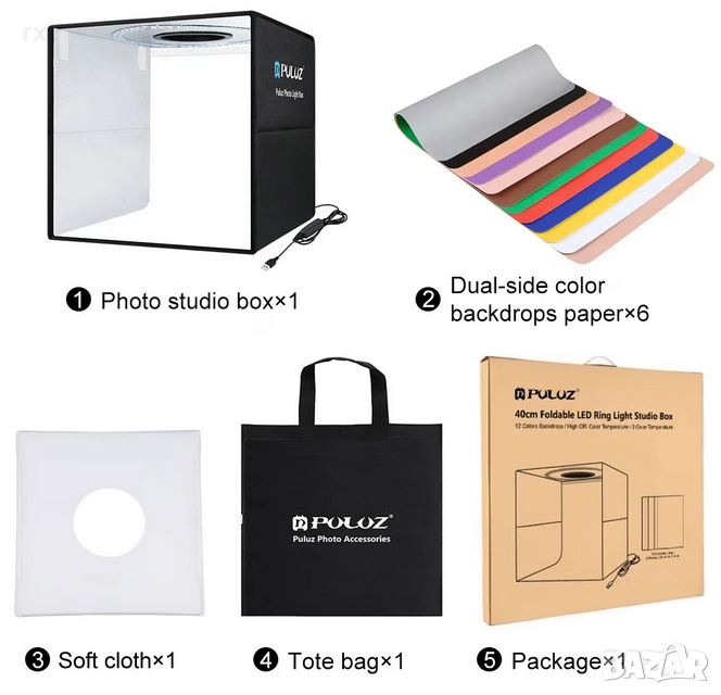сгъваема фотопалатка (лайтбокс) PULUZ с размери 40x40x40 см. Това е перфектното решение за продуктова фотография в домашни условия или в офиса.