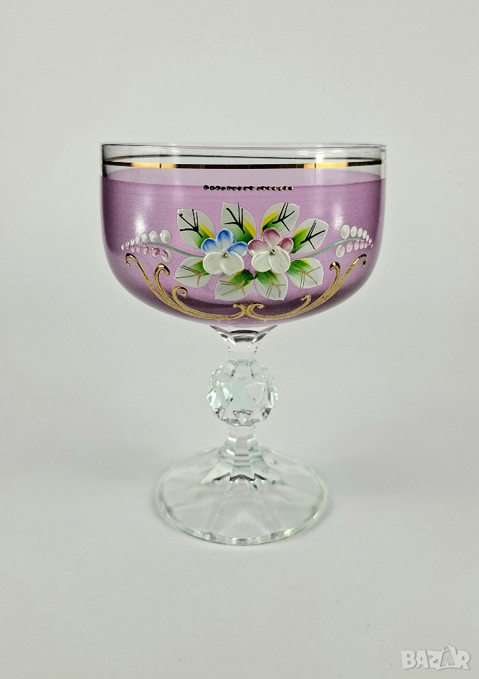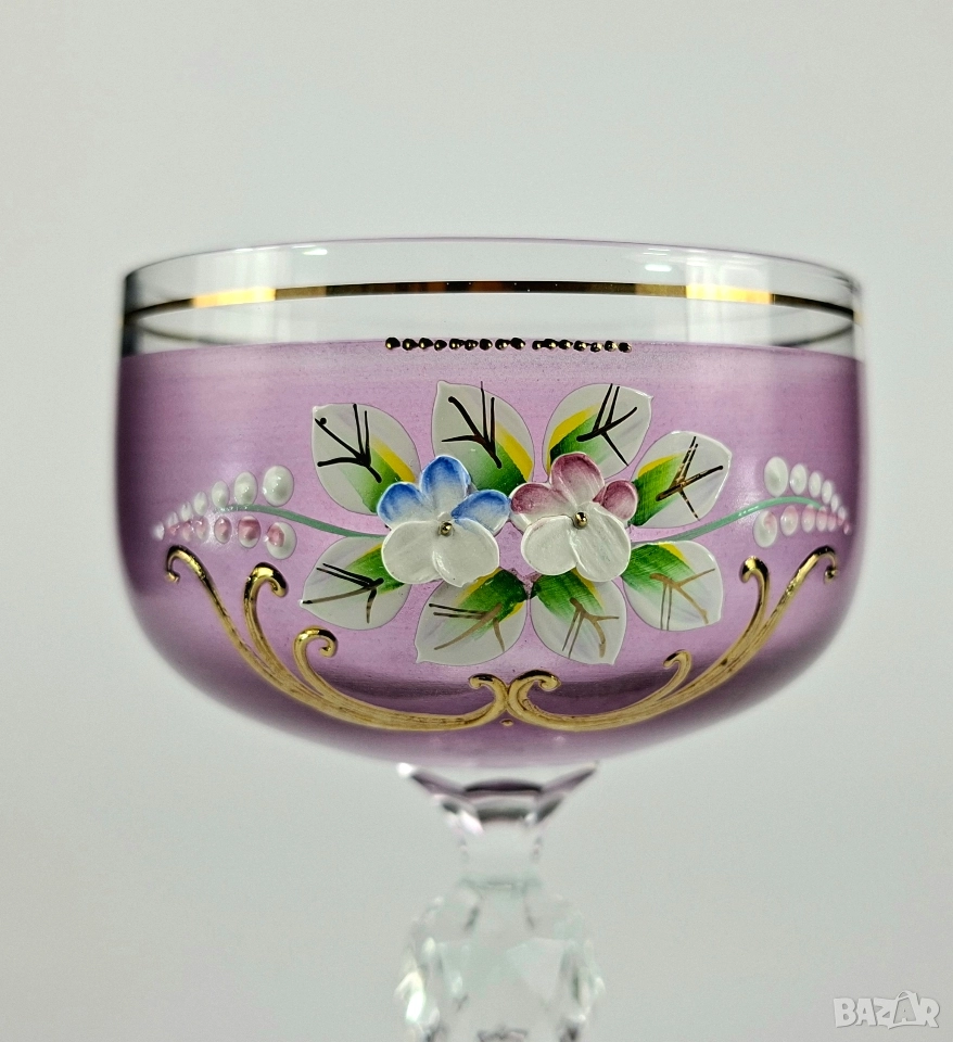Комплект елегантни стъклени чаши в лилав цвят, с ръчно рисувана флорална декорация