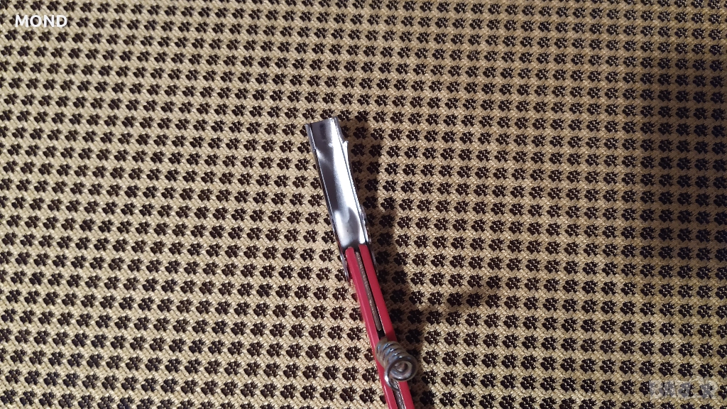 Ножът е като нов, с минимални следи (леко протриване на част от надписа), тъй като е носен в раница, но не е използван, както се вижда остриетата са без забележки, надрасквания и допълнителни заточвания.
