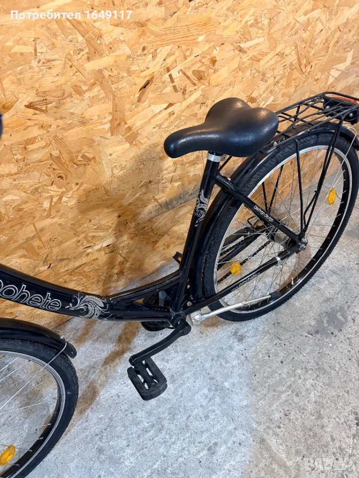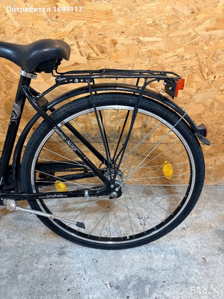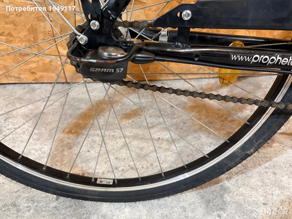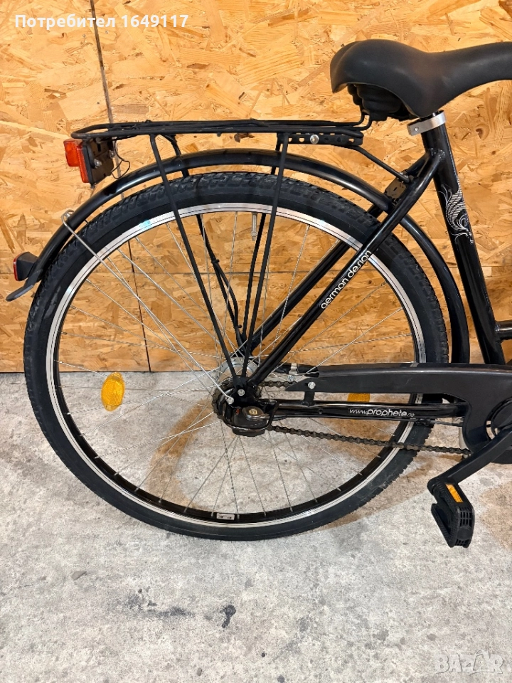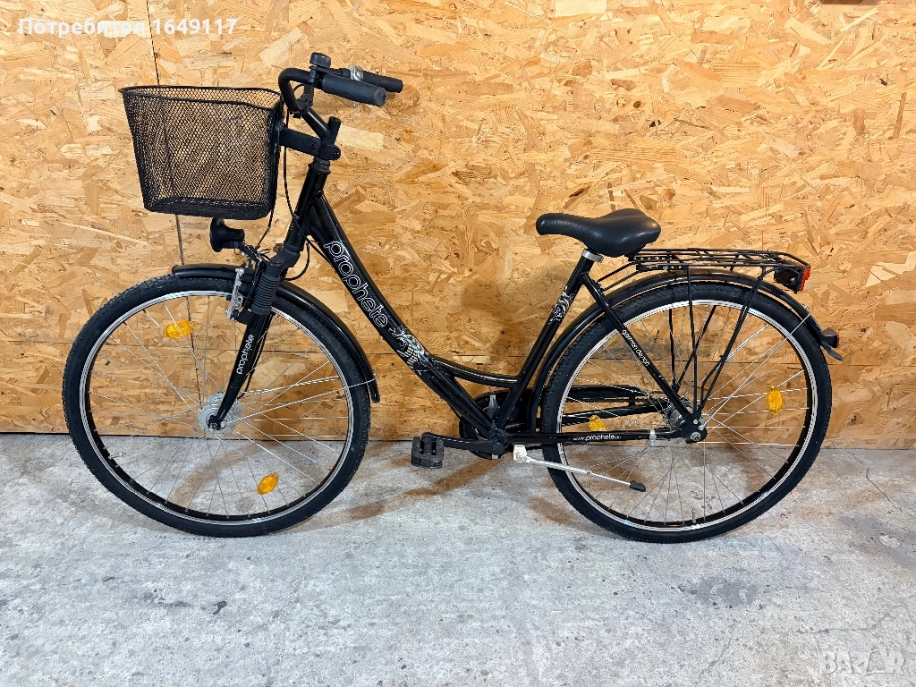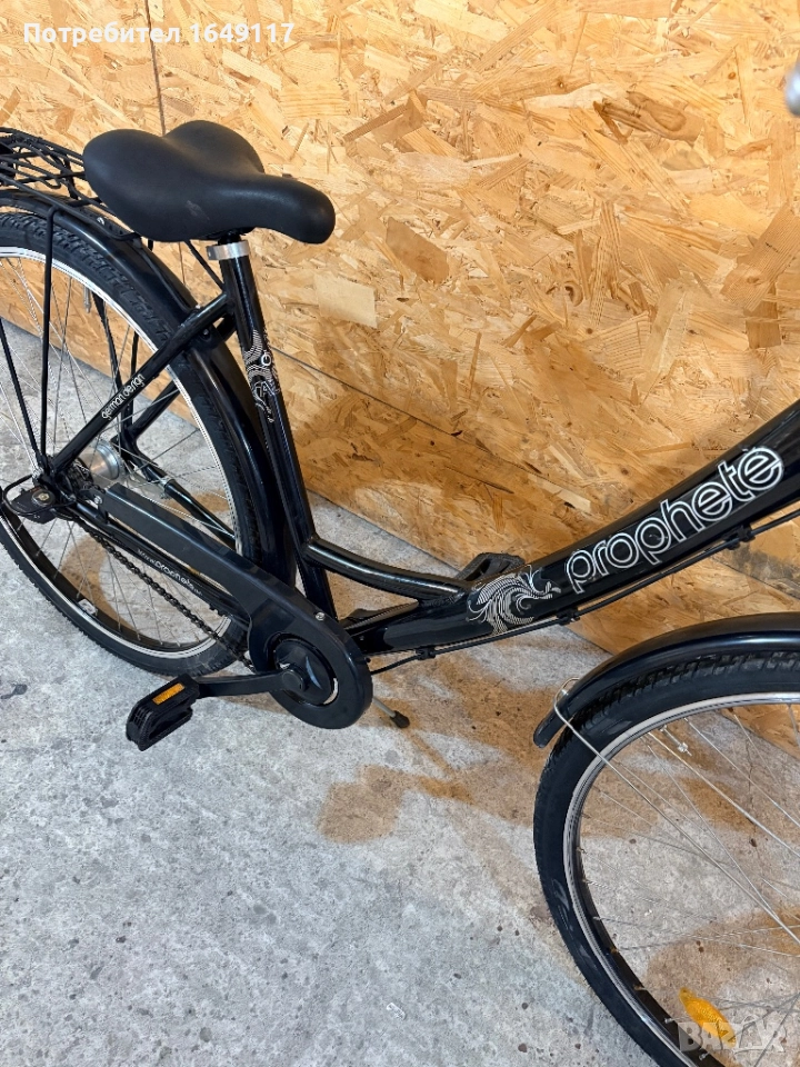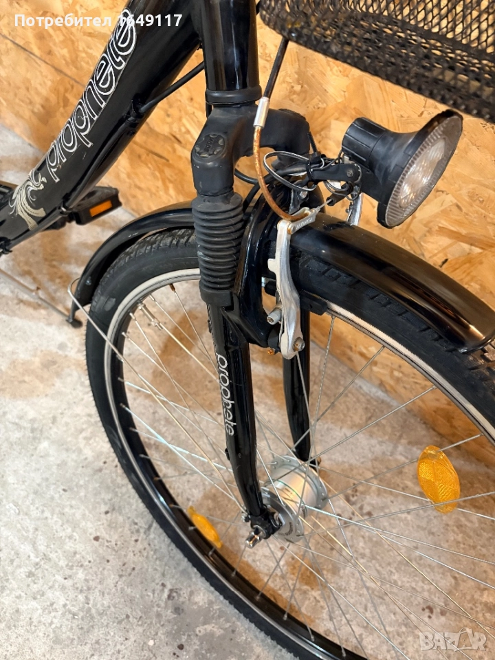 Продавам 28цола, съвсем малко употребяван, дамски-градски велосипед Prophete[made in Germany]. Олекотена, алуминиева рамка - 50см. Вътрешни скорости SRAM S7 - 7бр. c revo shift командa SRAM. Предна амортисьорна вилка. Широка, гелова седалка. Алуминиеви, двойностенни-капли[предна капла с динамо главина Shimano], и нови гуми с усилен градски профил. Предна алуминиева V-break спирачка + контра отзад. Широко градско кормило. Заден багажник с натоварване до 25кг + кошница за багаж отпред. Олекотени калници, алуминиева стойка, халогенен фар и габаритна светлина, светлоотразители, звънец.