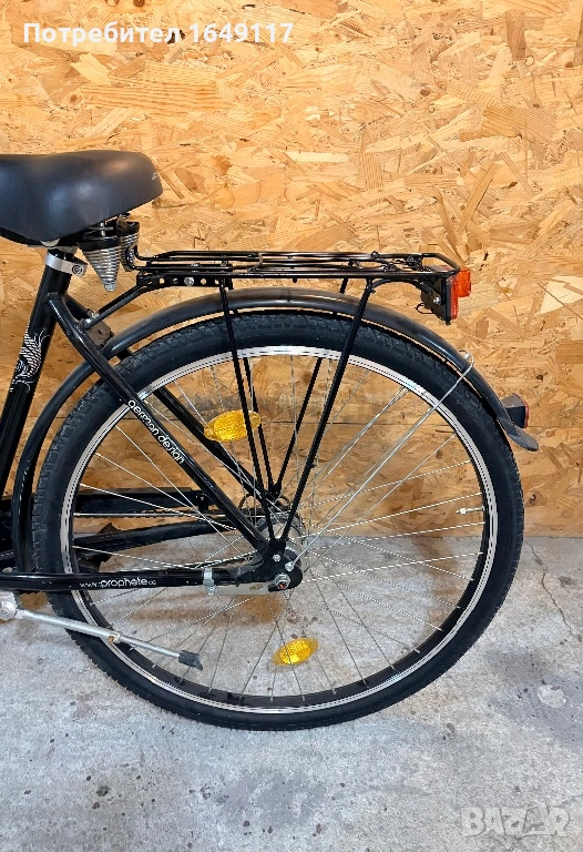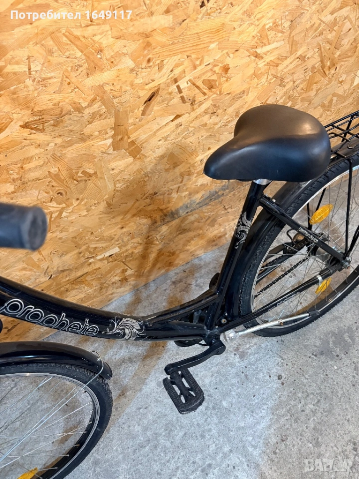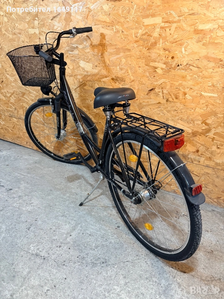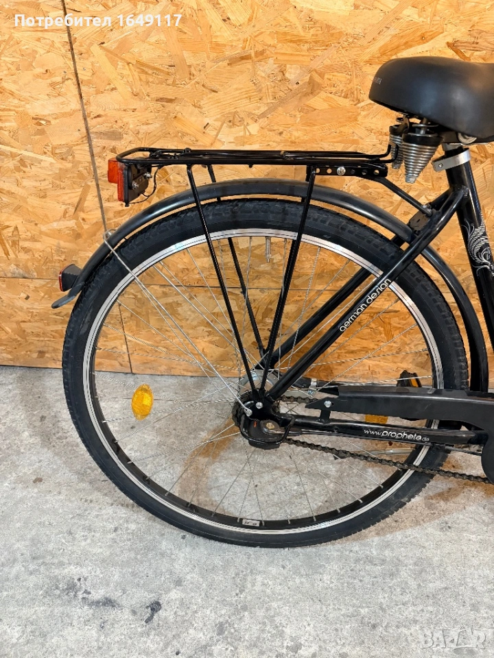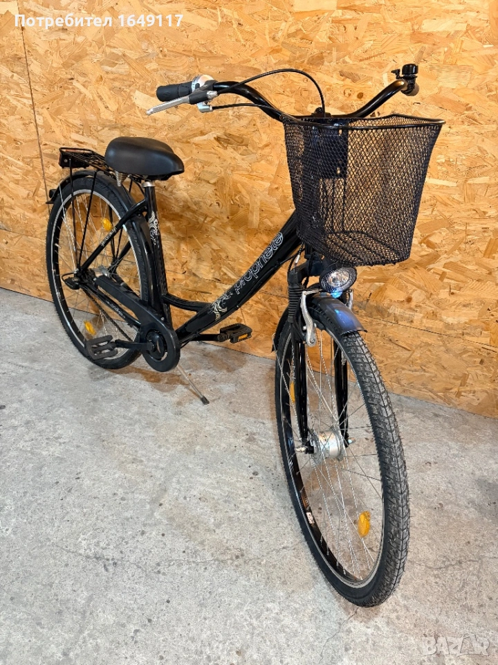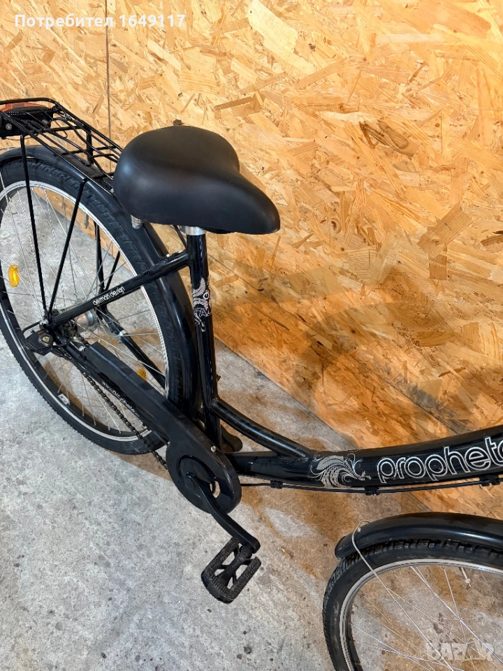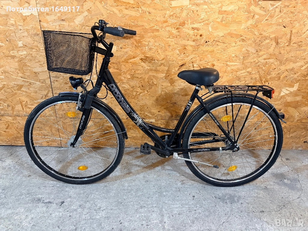 Продавам 28цола, съвсем малко употребяван, дамски-градски велосипед Prophete[made in Germany]. Олекотена, алуминиева рамка - 50см, с ниско прекрачване. Вътрешни скорости SRAM S7 - 7бр. c revo shift командa SRAM. Предна амортисьорна вилка. Широка, ергономична седалка. Алуминиеви, двойностенни-капли[предна капла с динамо главина Shimano], и нови гуми с усилен градски профил. Предна алуминиева V-break спирачка + контра отзад. Широко градско кормило. Заден багажник с натоварване до 25кг + кошница за багаж отпред. Олекотени калници, алуминиева стойка, халогенен фар и габаритна светлина, светлоотразители, звънец.
