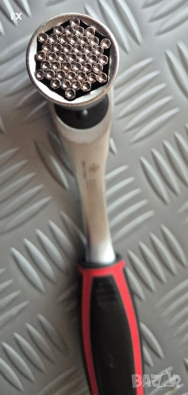 Универсалност: Вложката има 37 стоманени щифта, които се адаптират към всякакви форми – шестостенни гайки, куки, винтове с халки, квадратни болтове и дори повредени (заоблени) глави.
