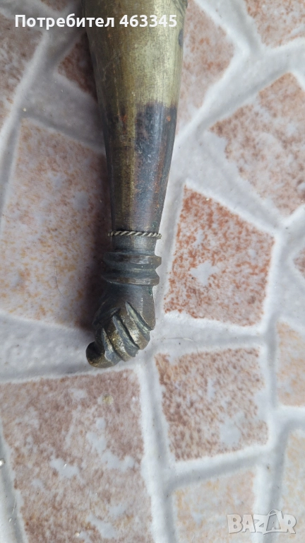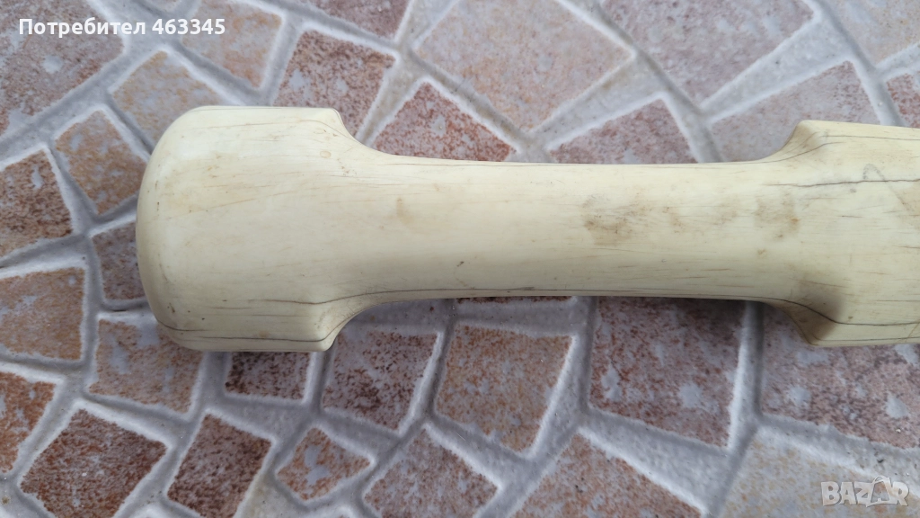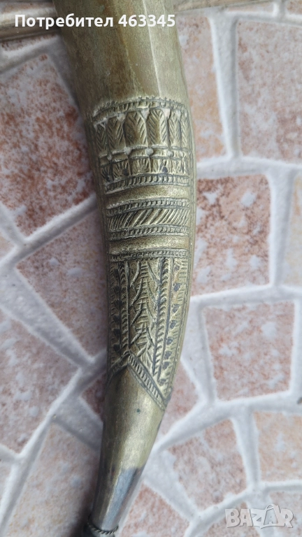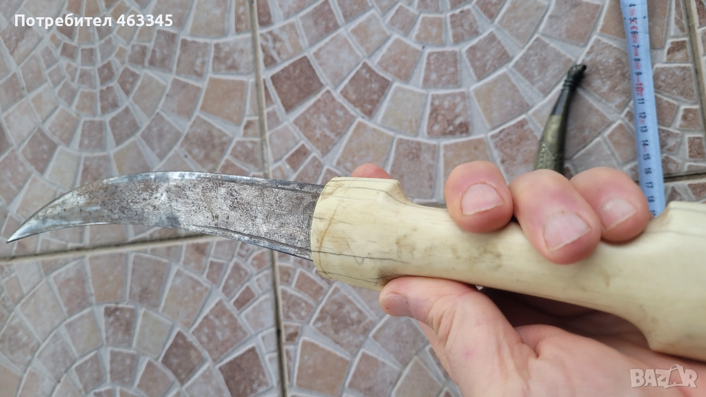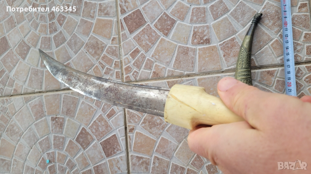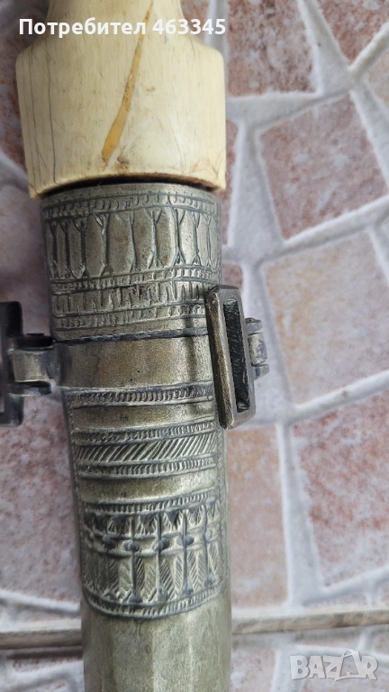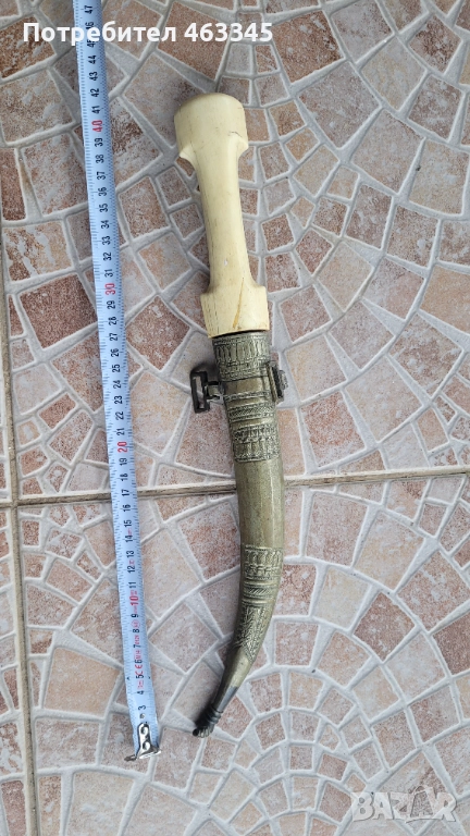 Изключителен Османски ханжар с дръжка от плътна слонова кост. Слоновата кост е без отчупено и наранено. Острието има патина и лека ръжда на места, но като цяло е в перфектно състояние, без язви. Налична ножна, облечена в жълта тахта, която е богато украсена с абстрактна чеканка. Изключителен нож