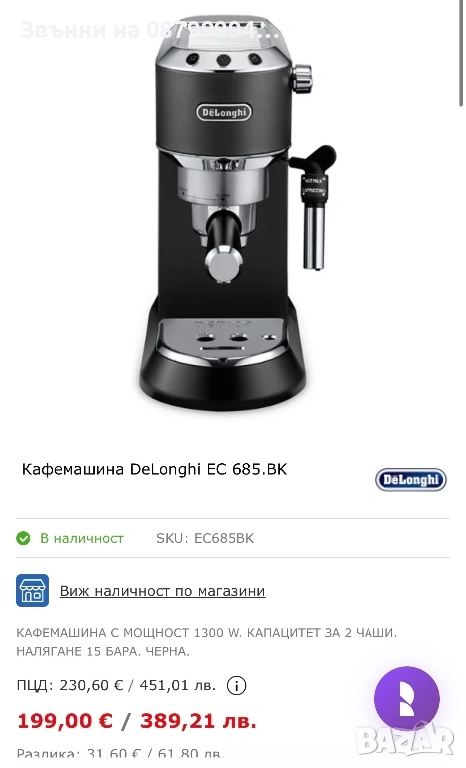 EC685.BK е компактна и стилна еспресо машина за домашна употреба, която съчетава италиански дизайн с добро качество на кафе.