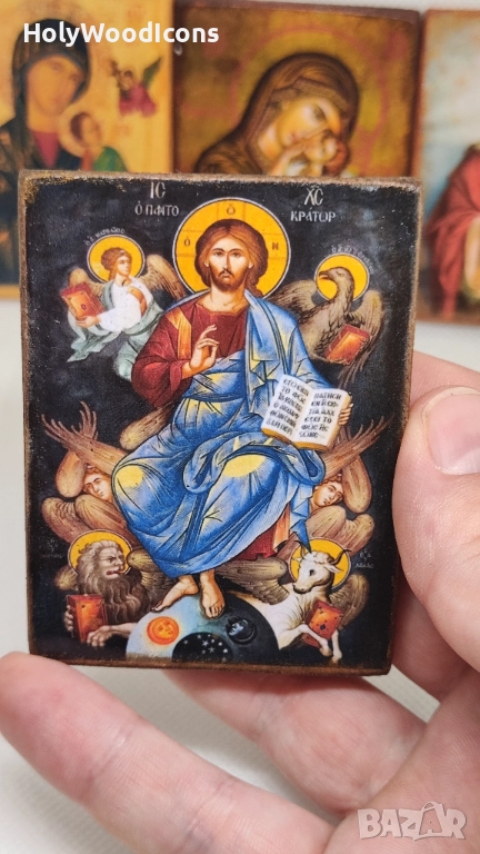 Икона Христос Пантократор с евангелистите – дървена икона с магнит 8x6см