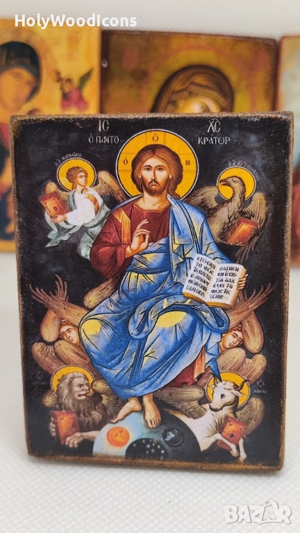 Тази дървена православна икона на Христос Пантократор изобразява Спасителя, седнал в слава, заобиколен от четирите символа на светите евангелисти – ангел (Матей), лъв (Марк), телец (Лука) и орел (Йоан). Образът е вдъхновен от апокалиптичните видения в книгите на пророк Йезекиил и Откровението на св. Йоан Богослов, и подчертава Христос като вечен Съдия и Вседържител на света.
