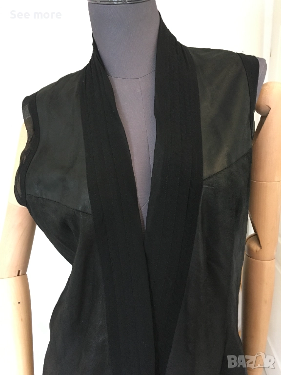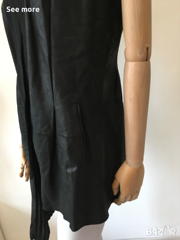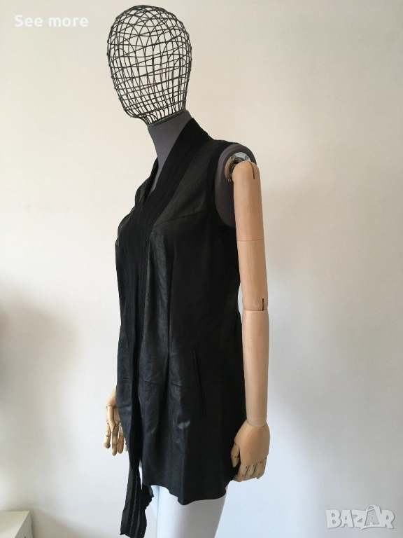 Елегантен елек от естествена кожа, размер S, в черен цвят. Уникален модел, подходящ за различни поводи и стилове. Съчетайте го с различни облекла за стилна визия.Дължина 77см,ГО 47 см!Отлично състояние!Изпращам по Еконт и Спиди!