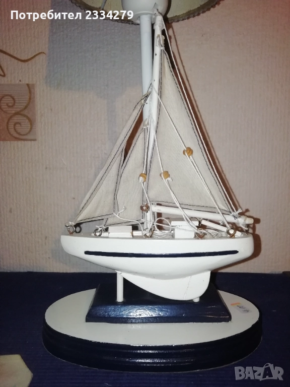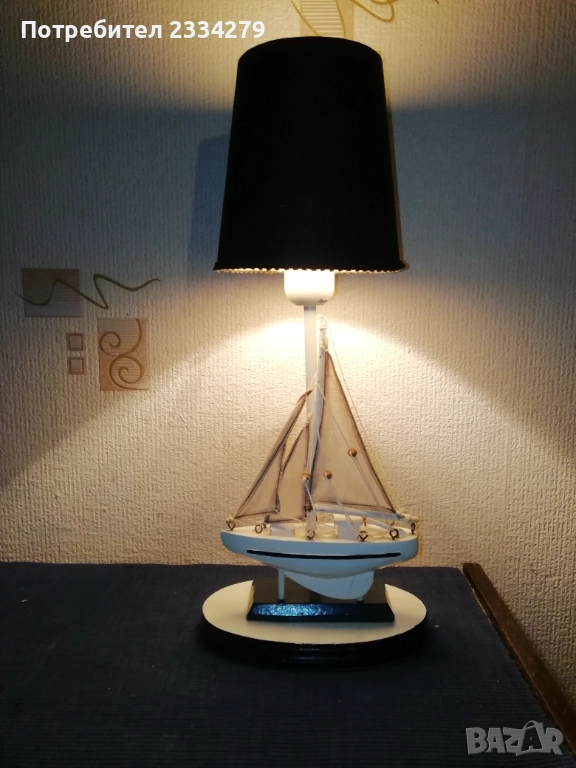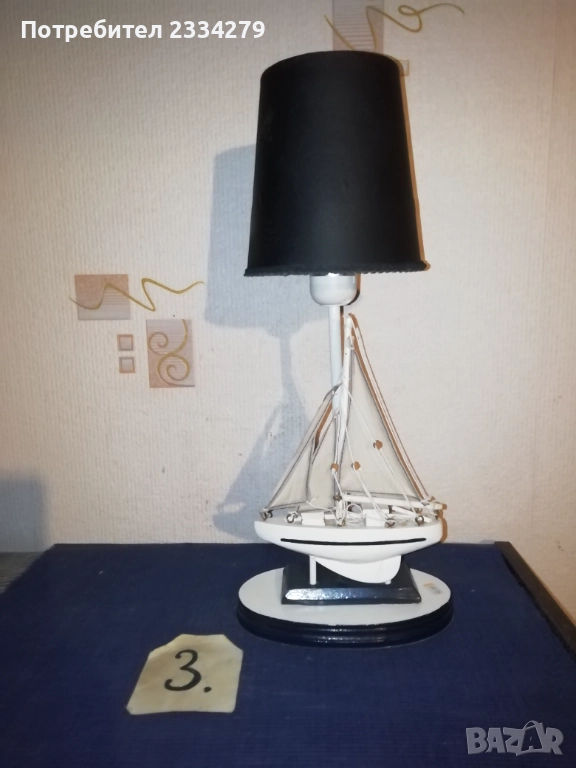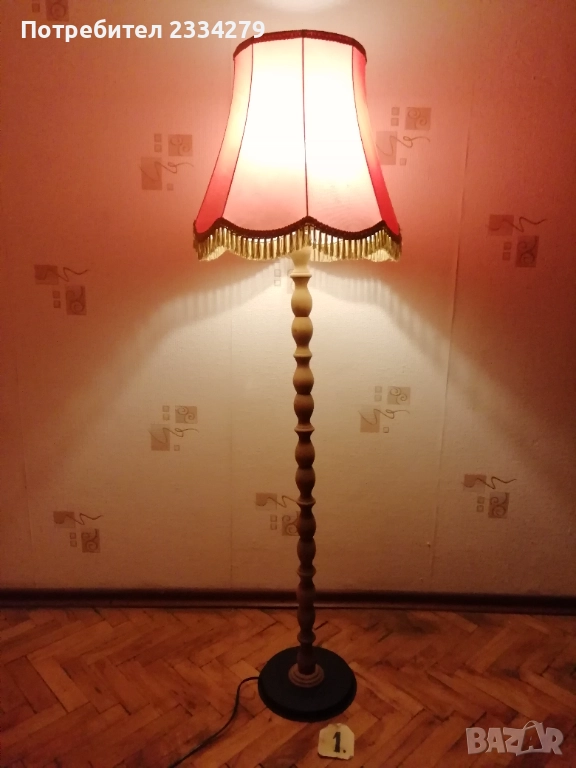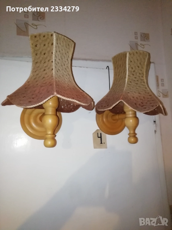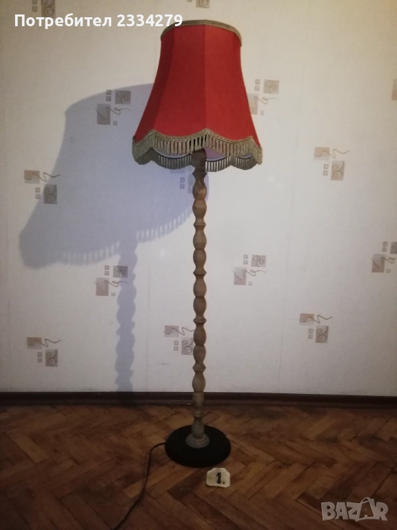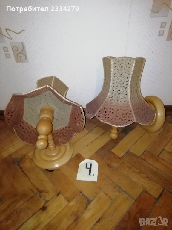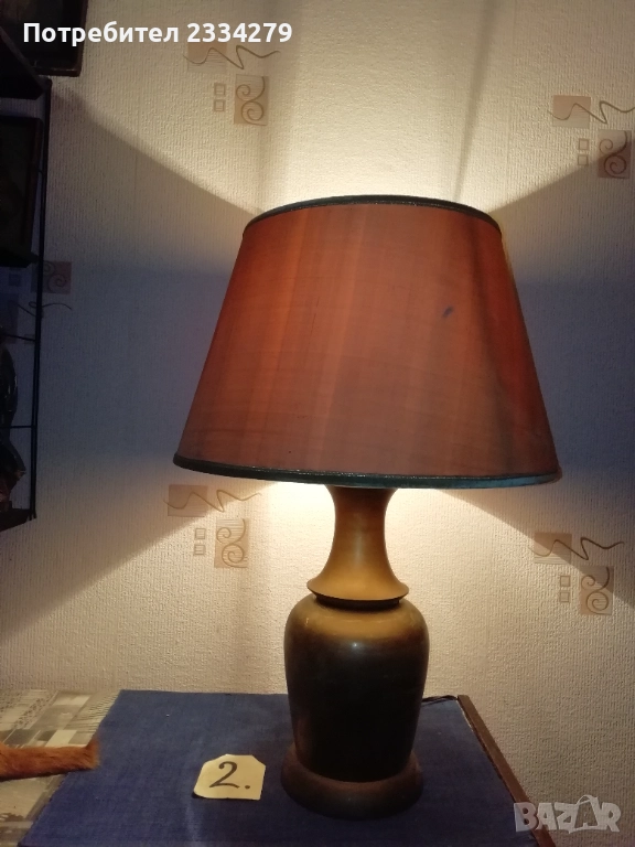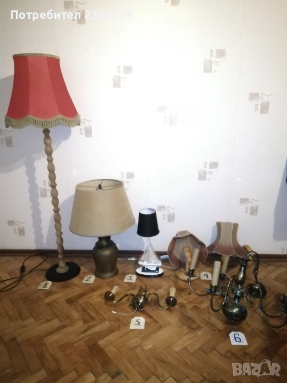 Стари нощни лампи: настолни, паркетна, лампа лампион за таван и аплици за стена, изработени в различни години, държави. N:1 паркетна нощна лампа, изработена от метал, орнаментирано дърво, купол от плат, размери: височина 1м.30см., широчина на купол 40см. цена 40лв.; N:2 автентична стара настолна голяма, масивна тежка над 3кг. чист бронз, нощна лампа с размери 57х40см., ръчна бронзова отливка с купол от плат, цена 50лв.; N:3 ръчно изработена дизайнерска настолна лампа кораб от дърво и купол от плат, подходяща към заведение, децка стая и други, цена 20лв.; N:4 две лампи за стена, аплици изработени от дърво тип