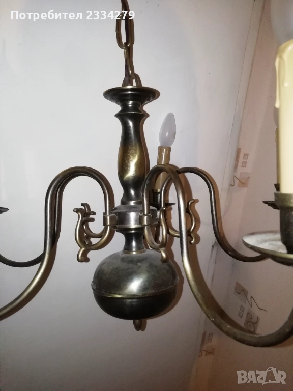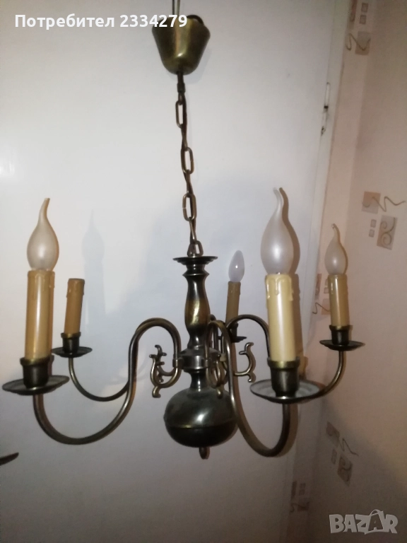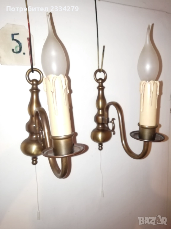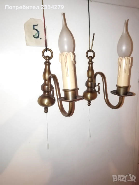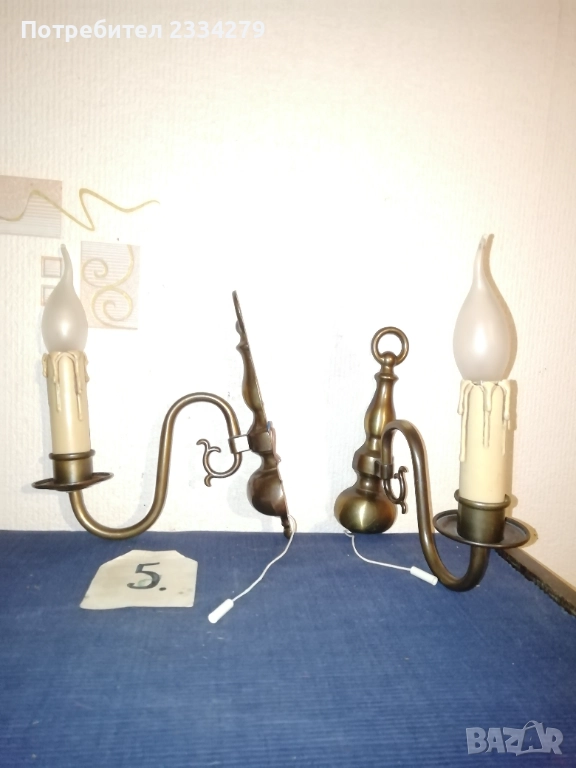 дърворезба, синтетични куполи, размери 30х25см., цена 35лв. за двата; N:5-6 бронзови лампи в бароков стил, два броя бронзови аплици за стена тип свещник, разсветващо ключе с дърпащо въженце, размери 22х19см., цена 50лв. двата; Лампиона е с пет гнезда масивен, бронзов с размери 75х55см., цена 50лв. ( при покупка на аплици и лампион комплект цена 80лв.)
