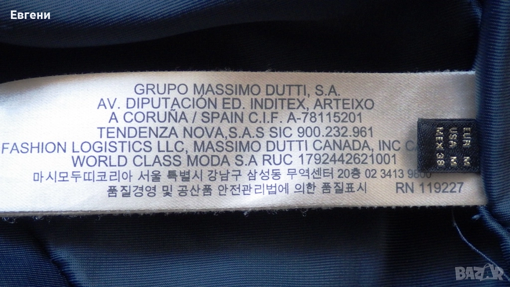 долния край са с ципове и копчета тик-так. С такива копчета и малки коланчета от двете страни, широчината на талията може леко да се коригира. Копчетата и машинките на циповете са с логото на Massimo Dutti. Има луксозна синя подплата. Всички тези детайли съм показал на снимките към обявата. Дължината на якето отпред при ципа е 62 см., дължината на ръкава от вътрешната страна (откъм тялото) е 47 см, широчина при раменете - 46 см., широчината от мишница до мишница е 55 см. а в долния край широчината е 49 см. Ципове и копчетата работят безупречно. Състоянието му е като ново, без дефекти и замърсявания. Лично го закупих от фирмения магазин на Massimo Dutti в МОЛ Сердика, но тъй като нямаше моя размер (S), а меракът ми беше много голям, ми се видя че и размер М ще ми свърши работа. Обаче след 1 - 2 обличания видях, че ми е леко голямо и не се чувствам добре в него. Заради тази грешка, въпреки че почти не е носено, реших вместо якето да отлежава в калъфа си в гардероба, да го предложа на половин цена.
