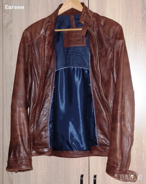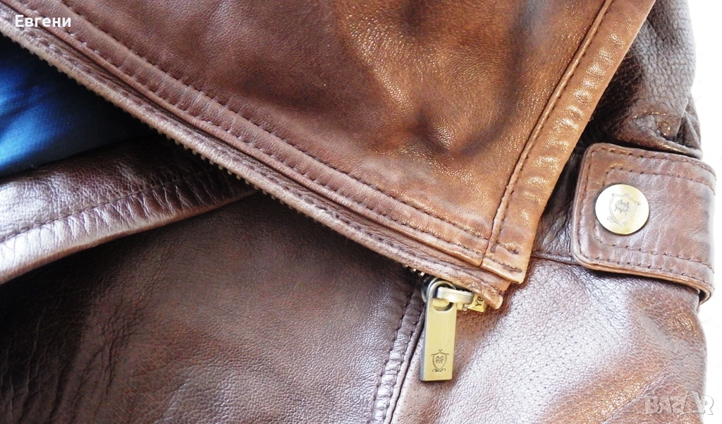 Предлагам оригинално кожено яке на испанската марка Massimo Dutti, размер М, изработено от напа от агнешка кожа, с висока (“войнишка”) яка, закопчаваща се с коланче. Отпред закопчаването е с здрав месингов цип като и на двата странични джоба, а горе вляво има малко джобче. Има и вътрешен джоб с копче тик-так. Ръкавите в