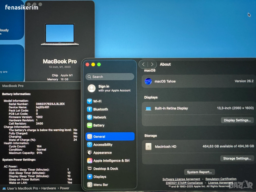 Mакбука е в отлично визуално и техническо състояние. В комплект със зарядно у-во + type C кабел. Батерията е в normal condition, само на 164 цикъла е, 91% здраве и издържа до 14 часа. Инсталиран най-новия Mac OS Sequoia 15.0, преди пускане на обявата, без акаунти, iCloud пароли и т.н.