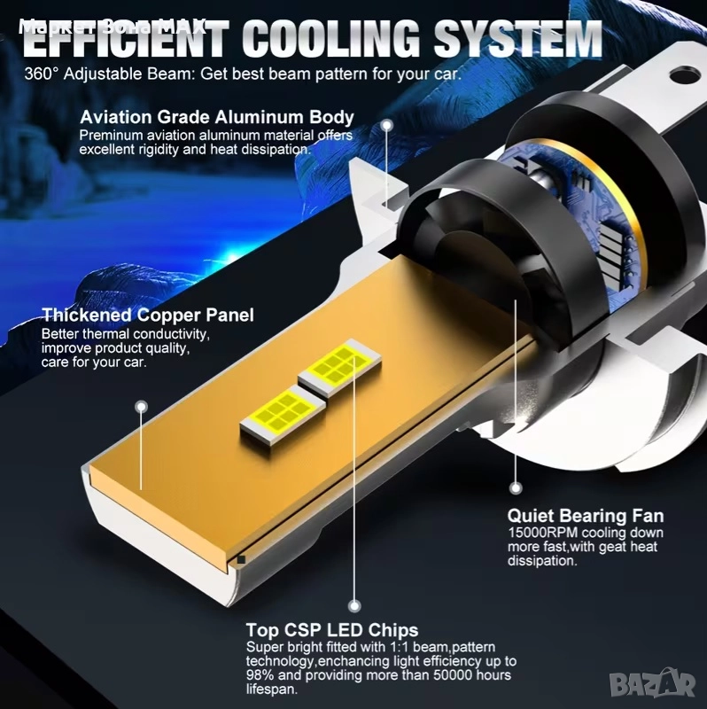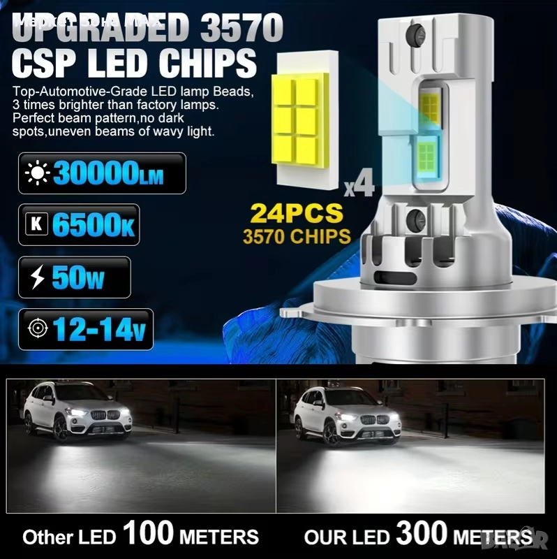 Супер ярки: 50W, 30000LM, до 800% по-ярки от стандартните.