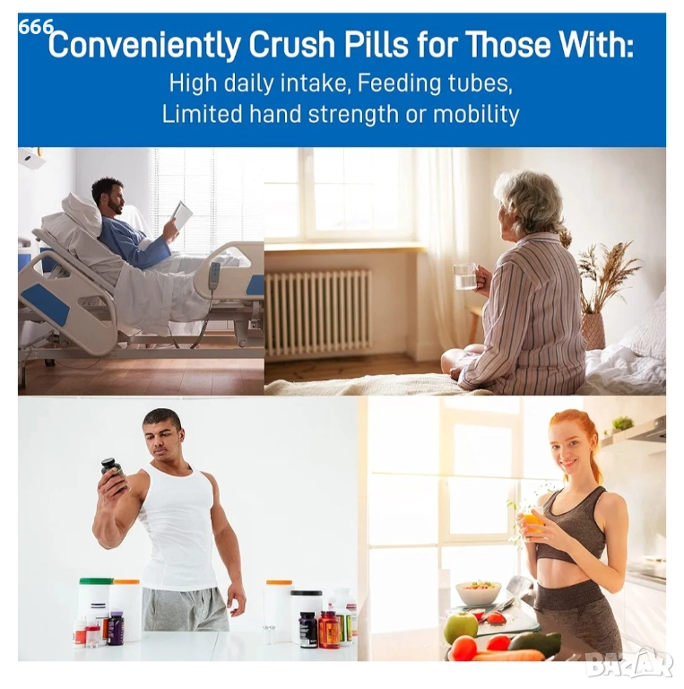 【Лесна за употреба трошачка за лекарства】Нашата автоматична трошачка за хапчета е идеална за хора със слаб захват, с артрит или ограничена подвижност. Трошачката за хапчета може да се използва и за смилане на лекарства, витамини и добавки за капризни домашни любимци.
