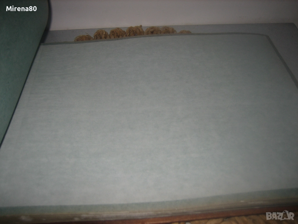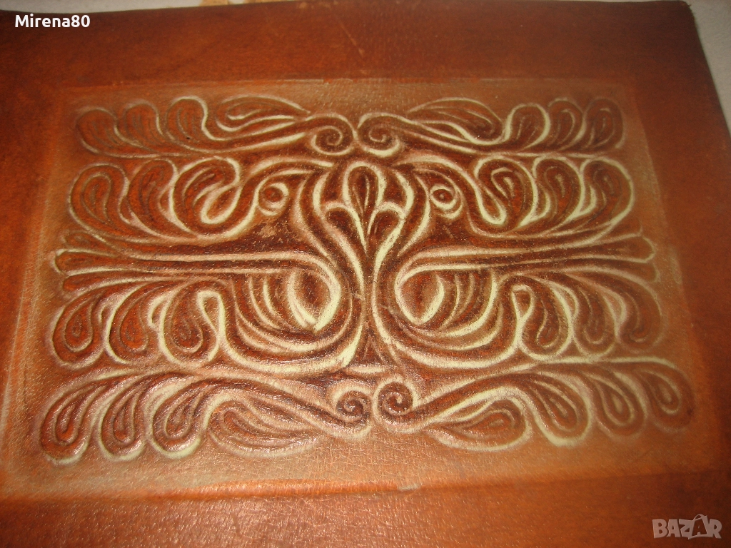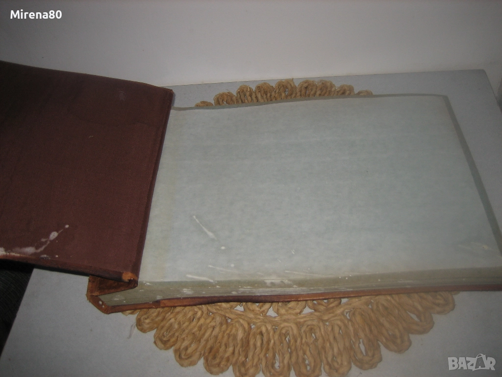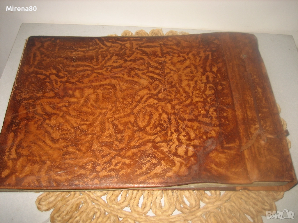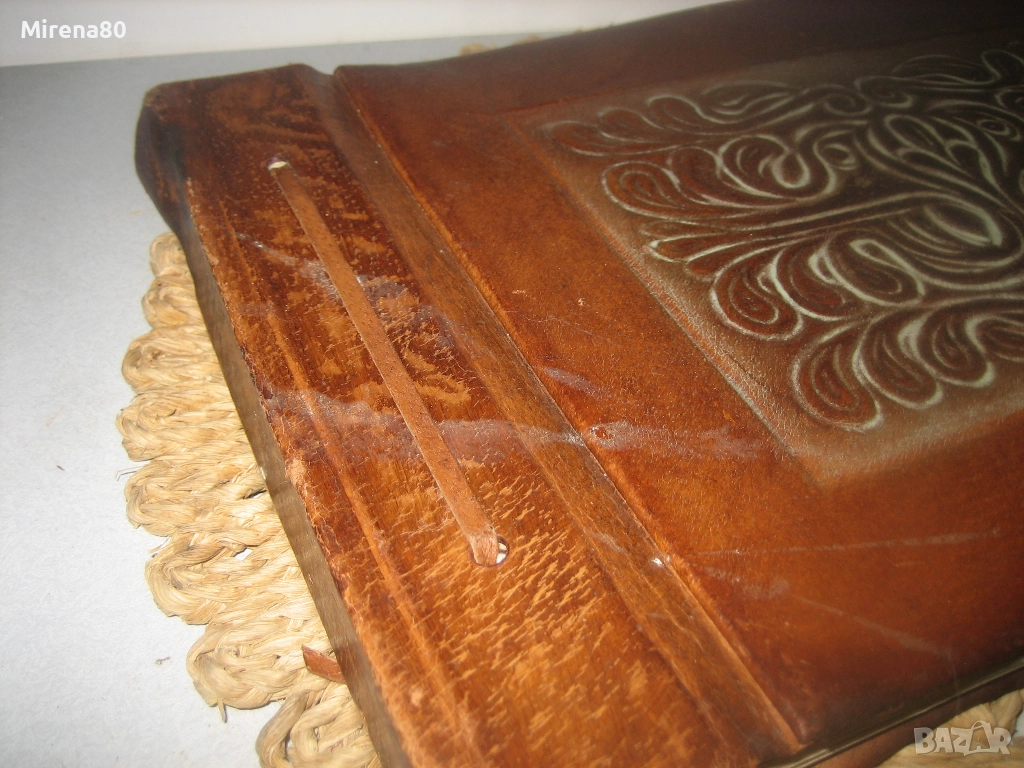 художествените занаяти - София. Тежък, тежи сигурно към 2 кг.. Корицата е с много ефектна обработка на кожата - 2 стилизирани релефни гълъби.За снимки или марки - с оризова хартия между страниците. Нов, неизползван, но вътрешната корица и по първата страница има малки бели петънца..Другите назад са отлични.
