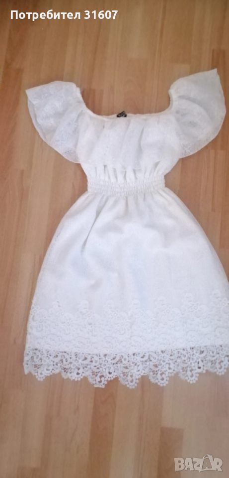 Красива, бяла дантелена рокля на българската марка МАНУЕЛА. Паднали рамене, еластична талия и богата дантела в долната част.