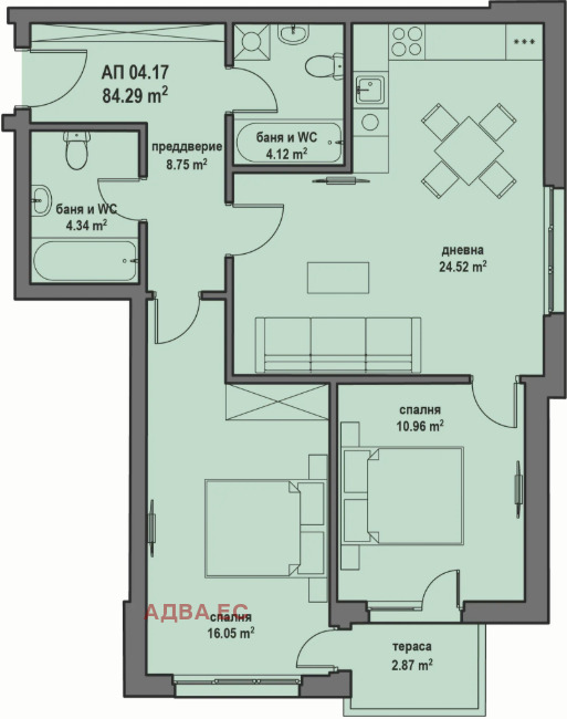 Строително-инвестиционна компания АДВА-ЕС предлага за продажба тристаен апартамент в луксозния жилищен комплекс Evergreen Bankya.