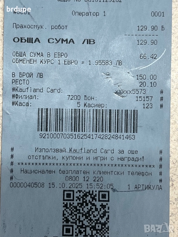 Прахосмучката е закупена от Кауфланд на 15.10.2025 година с 3 години гаранция.