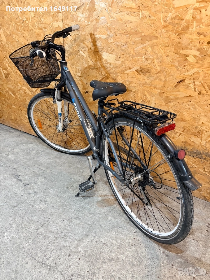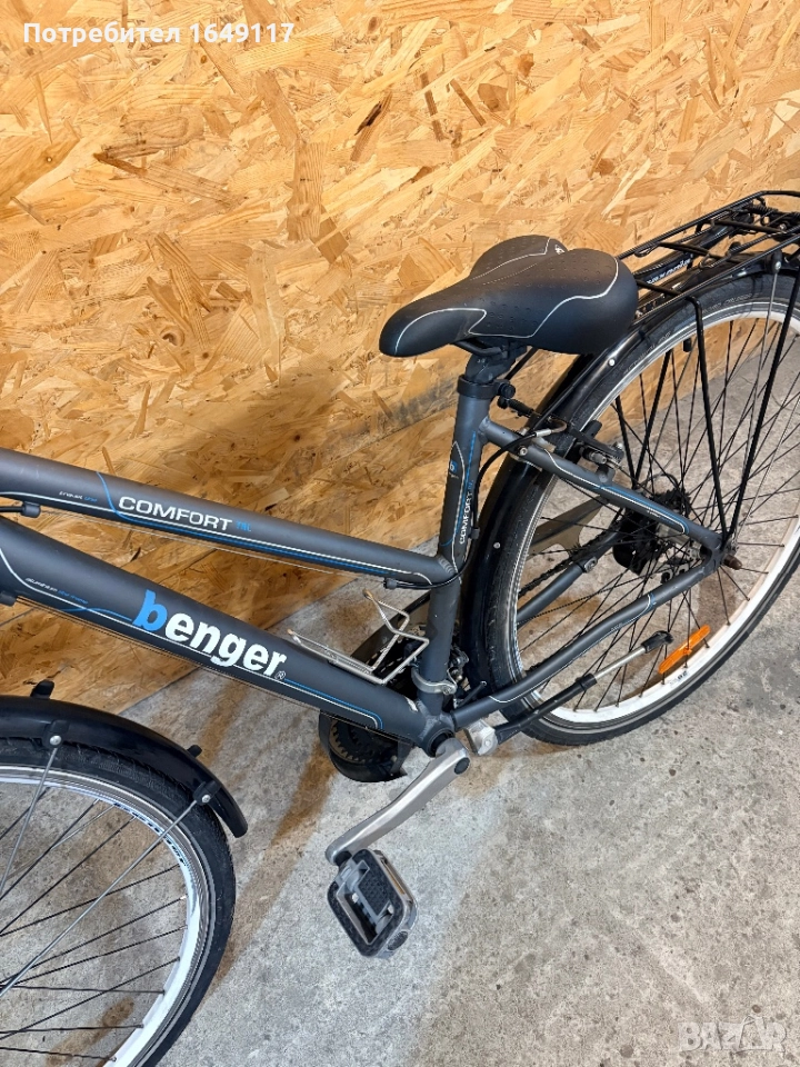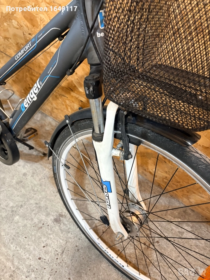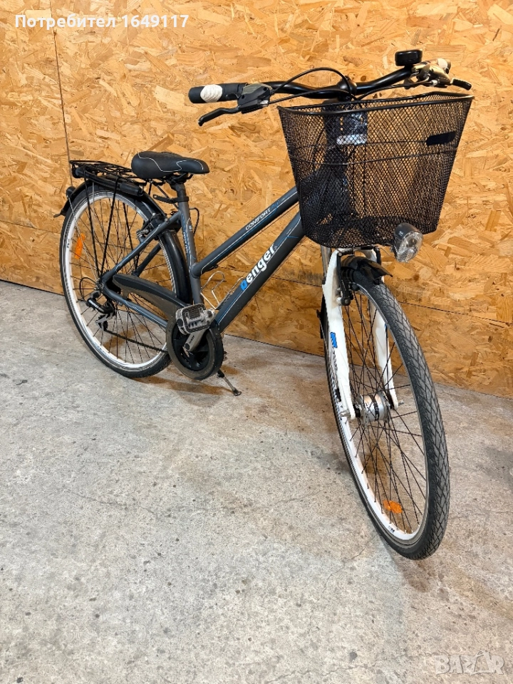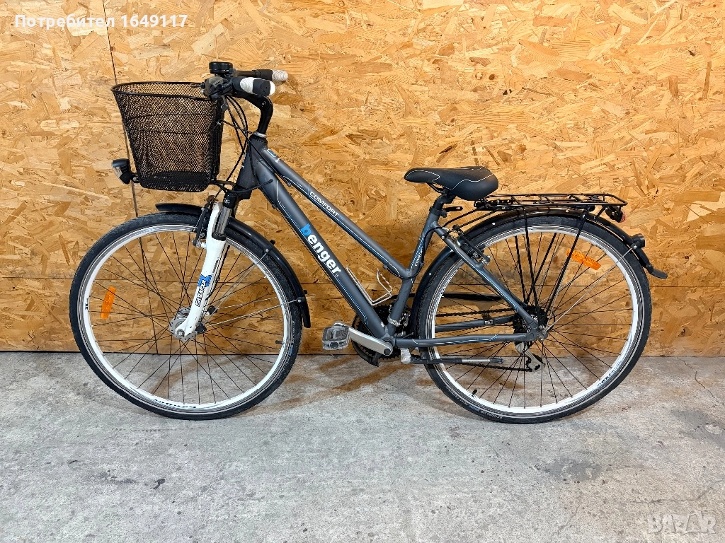 Продавам 28цола, малко употребяван дамски градски велосипед Berger Comfort TRL[made in Austria]. Олекотена, алуминиева рамка - 44см. Външни скорости Shimano Acera - 21бр. c палцови команди Shimano. Предна алуминиева-амортисьорна вилка SR Suntour. Алуминиеви курбели. Широка, ергономична седалка с алуминиео колче. Алуминиеви, двойностенни капли[предва капла с динамо главина Shimano], и гуми Schwalbe с усилен градски профил. Предна и задна алуминиеви V-break спирачки Promax. Широко алуминиево кoрмило с алуминиева раздвижна лапа. Заден багажник с натоварване до 25кг + кошница за багаж отпред. Олекотени пласмасови калници, алуминиева стойка, звънец, диоден фар с диодна габаритна светлина, светлоотразители. Алуминиева кошничка за бутилка, помпа за гуми.