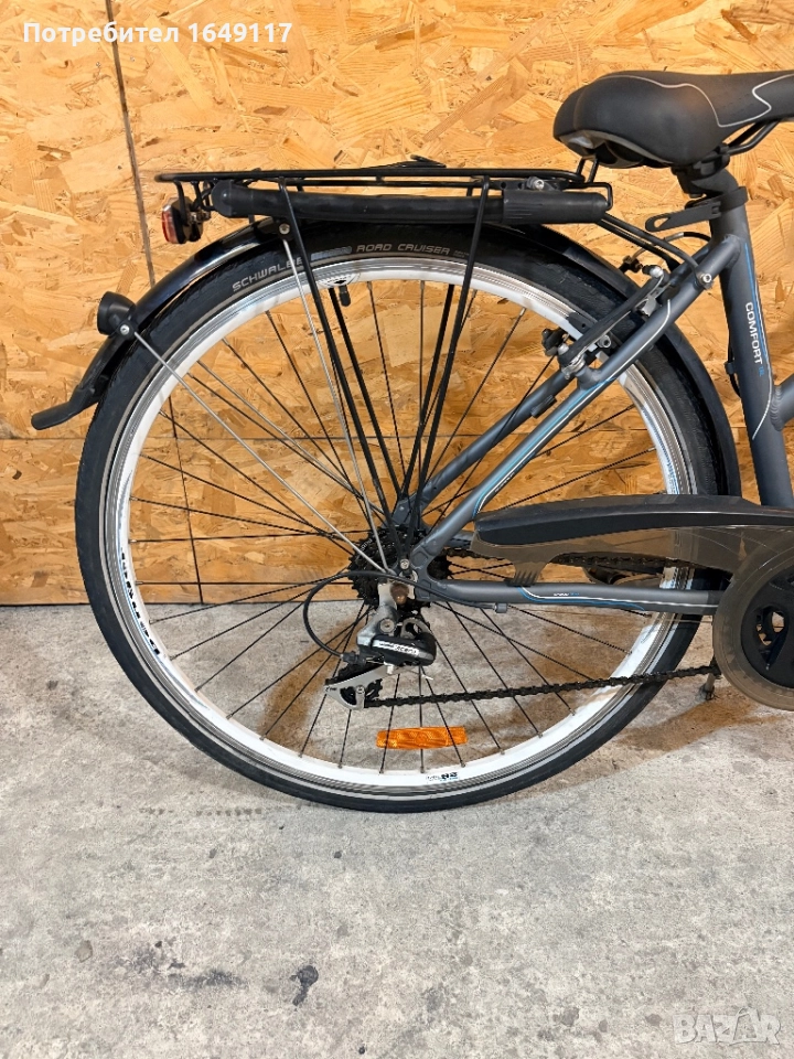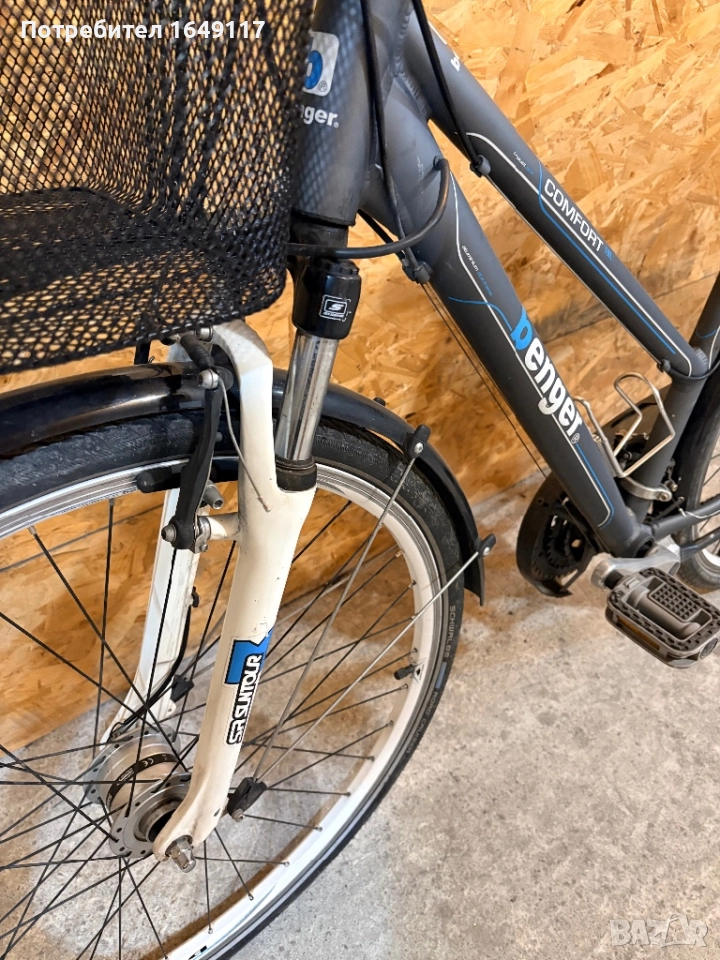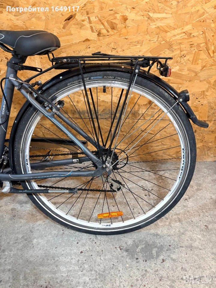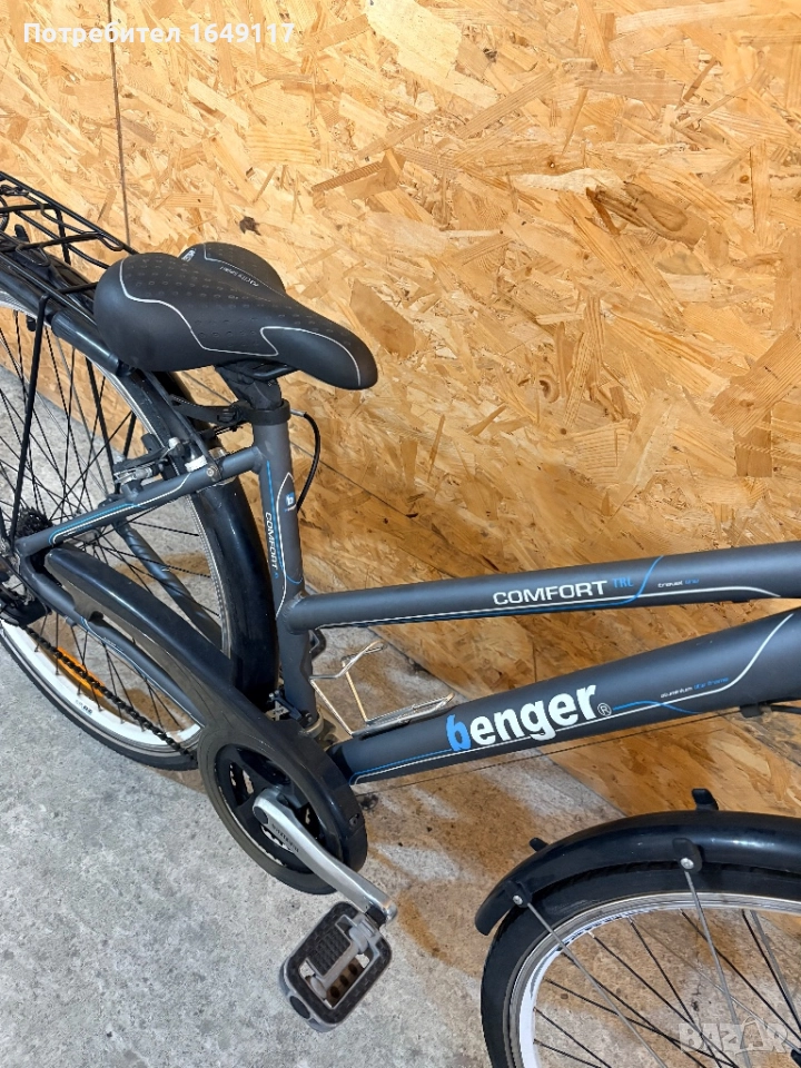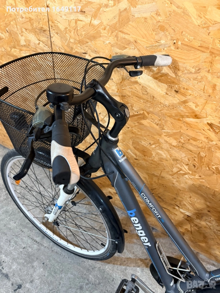 Продавам 28цола, малко употребяван дамски градски велосипед Berger Comfort TRL[made in Austria]. Олекотена, алуминиева рамка - 44см. Външни скорости Shimano Acera - 21бр. c палцови команди Shimano. Предна алуминиева-амортисьорна вилка SR Suntour. Алуминиеви курбели. Широка, ергономична седалка с алуминиео колче. Алуминиеви, двойностенни капли[предва капла с динамо главина Shimano], и гуми Schwalbe с усилен градски профил. Предна и задна алуминиеви V-break спирачки Promax. Широко алуминиево кoрмило с алуминиева раздвижна лапа. Заден багажник с натоварване до 25кг + кошница за багаж отпред. Олекотени пласмасови калници, алуминиева стойка, звънец, диоден фар с диодна габаритна светлина, светлоотразители. Алуминиева кошничка за бутилка, помпа за гуми.