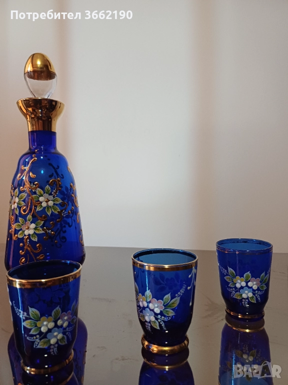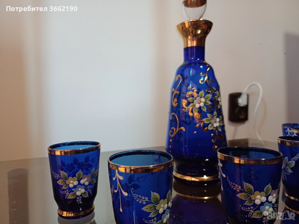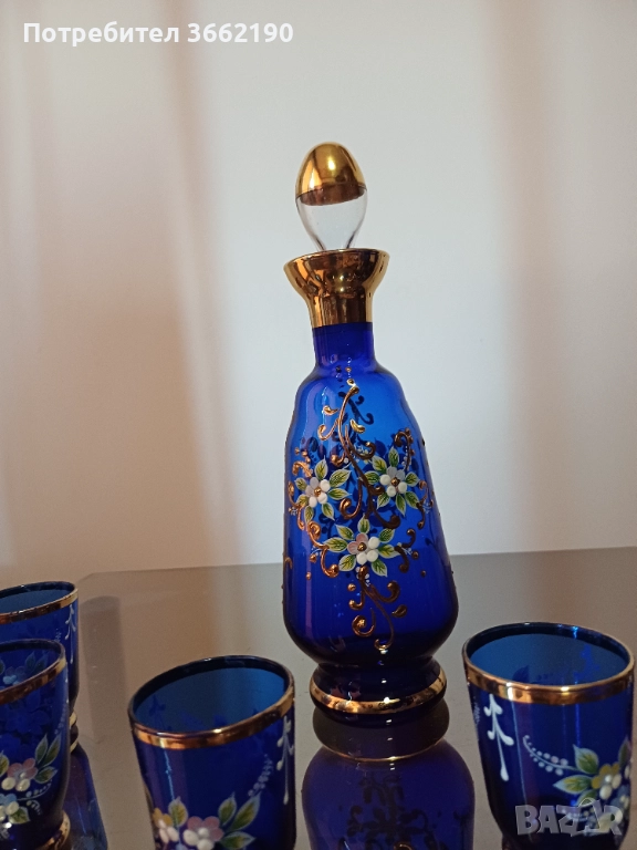 Сервиз Мурано от красива бутилка и шест чаши.Две от чашките имат леки изтривания на позлатата и цената е съобразена с това.За аперитив.Част от лична колекция.Моля, разгледайте и другите ми обяви!