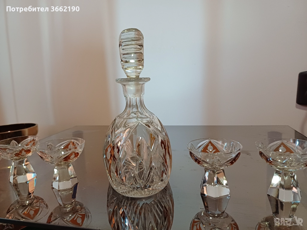 Много красив кристален сервиз на чешката фирма"Бохемия" за ликьор или шотове. Гарафа и 4 чаши от рязан кристал. Отлично състояние.Част от личната ми колекция.Моля, разгледайте и другите ми обяви!