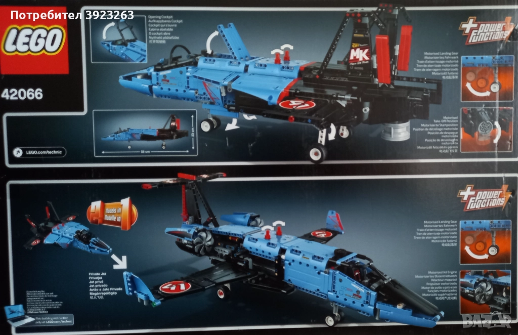 42066 Реактивен самолет за състезания LEGO Technic. Реактивният самолет за състезания от LEGO® Technic, е оцветен в синьо, бяло и червено и има страхотни стикери, множество автентични детайли и моторизирани функции. С двигателя Power Functions – можете да придвижвате дюзата на реактивния двигател в положение за хоризонтално или вертикално излитане, да отваряте корпуса, да сваляте и прибирате колесника, да отваряте люка, за да се вижда въртящият се турбовентилатор, и да нагласяте задкрилките за режим на летене! Има предно управление, движеща се опашка и отваряща се пилотска кабина. Когато ви се прииска да сглобите нещо ново, можете да го превърнете в страхотен частен самолет!