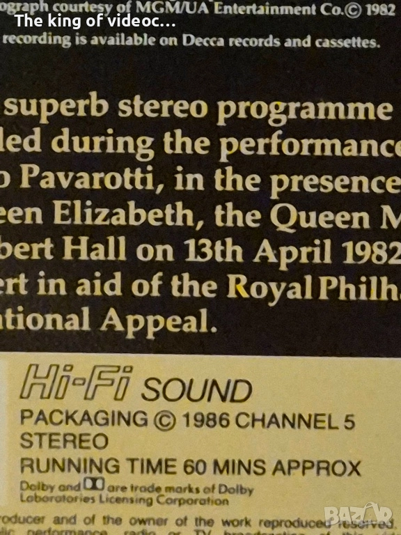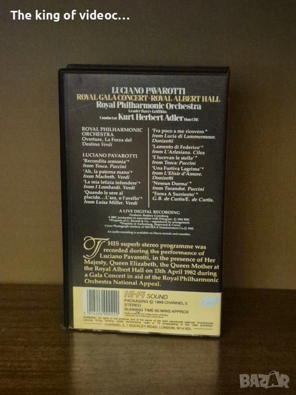 Продавам оригинална видеокасета Pavarotti . Тази превъзходна стерео програма е записана по време на изпълнението на Лучано Павароти, в присъствието на Нейно Величество Кралица Елизабет, Кралицата Майка, в Роял Албърт Хол на 13 април 1982 г. по време на гала концерт в подкрепа на Националния апел на Кралския филхармоничен оркестър.