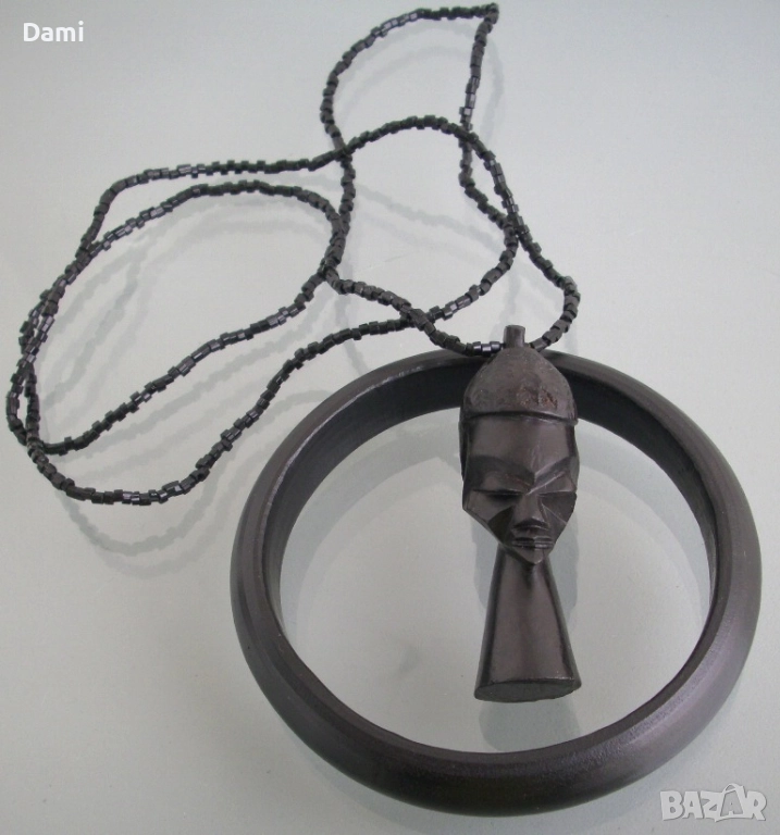 Стилен комплект колие с висулка и гривна, ръчно изработени от африканско черно дърво Grenadilla, Мозамбик. Дървото е тежко, с висока плътност и влагоустойчивост, с фина текстура, на ярка светлина се виждат тъмно червени и кафяви нюанси.