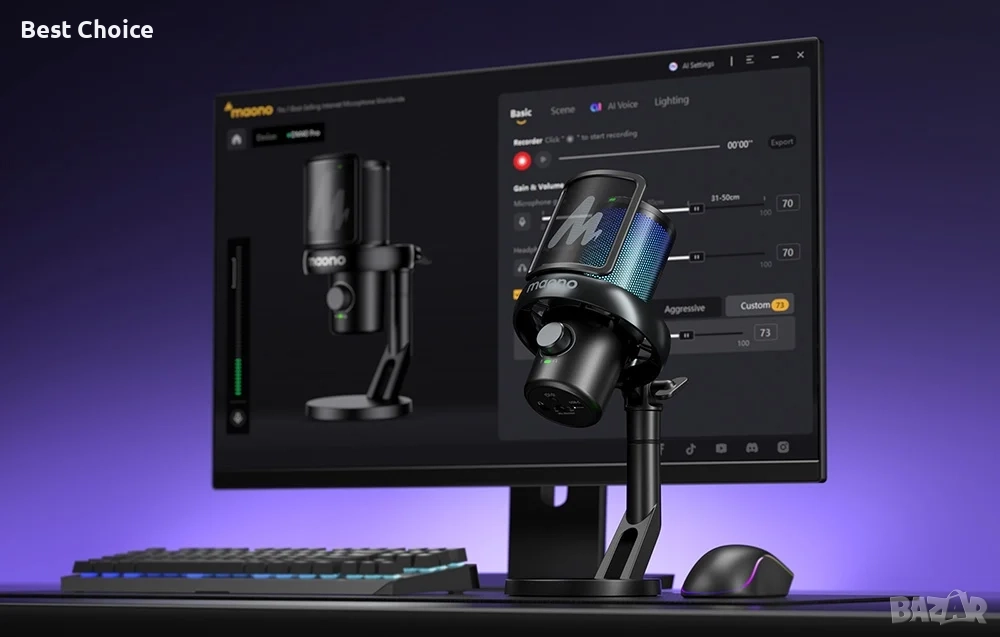 AI функции: Включва 10 различни режима за промяна на гласа с изкуствен интелект чрез приложението Maono Link, което добавя забавление към стриймове и гейминг сесии.