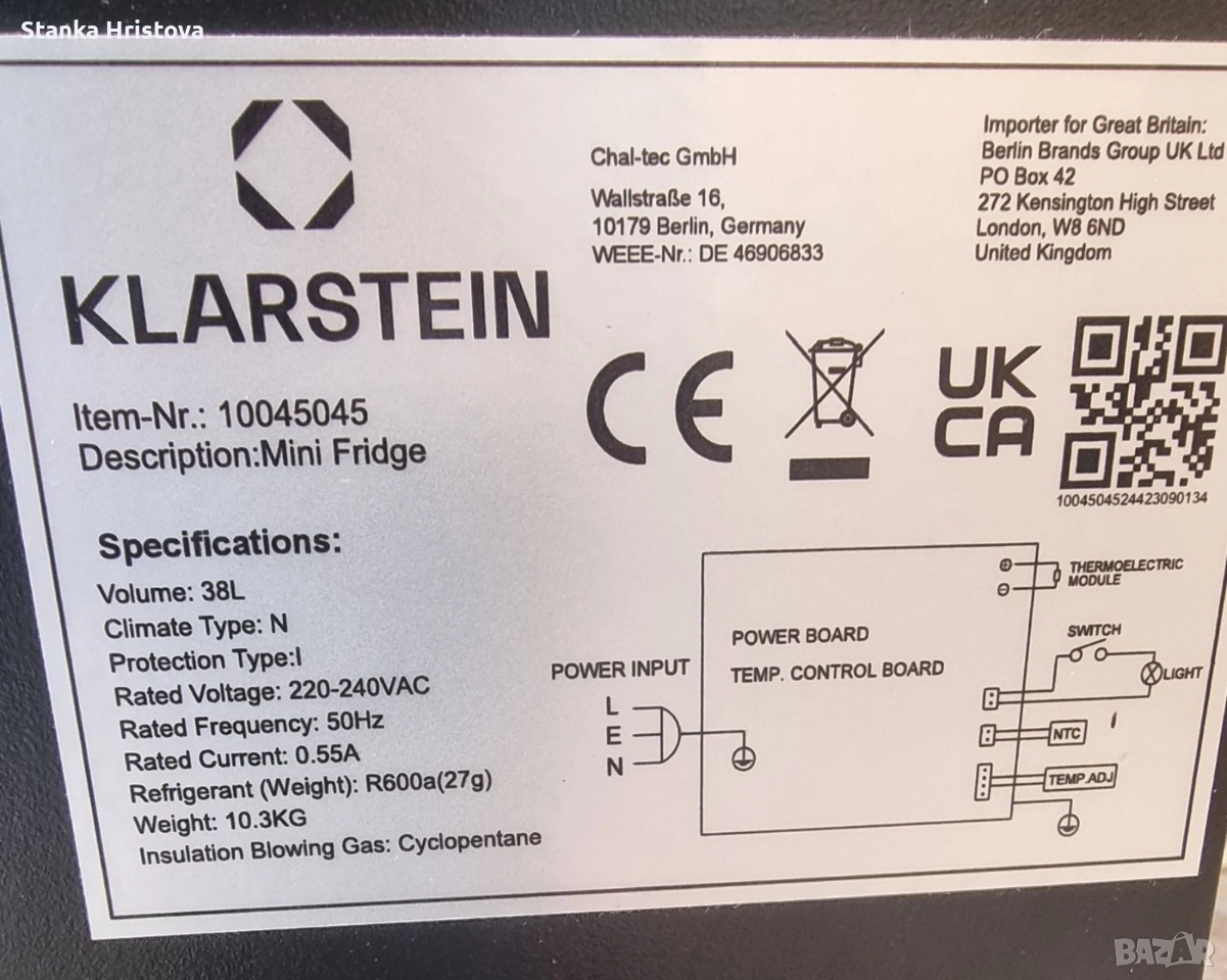 Продавам Работещ Чисто нов Мини хладилник Klastein 38L. Внос от Германия.