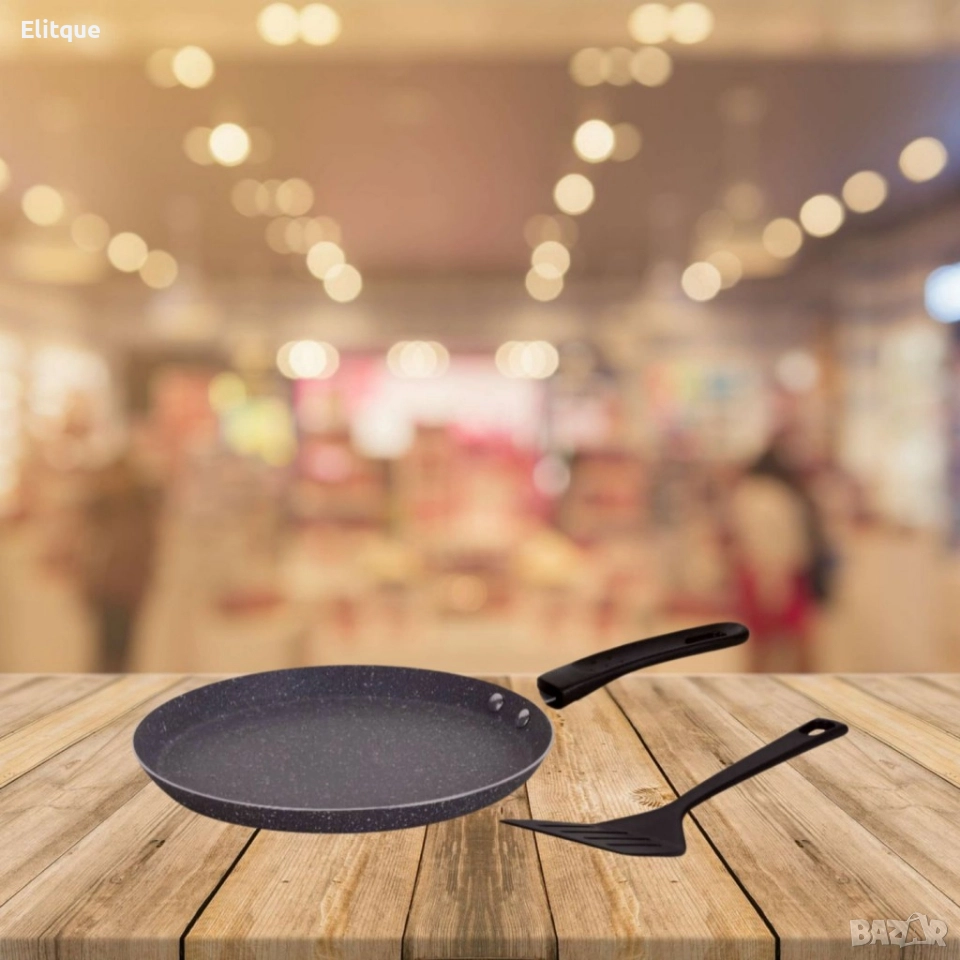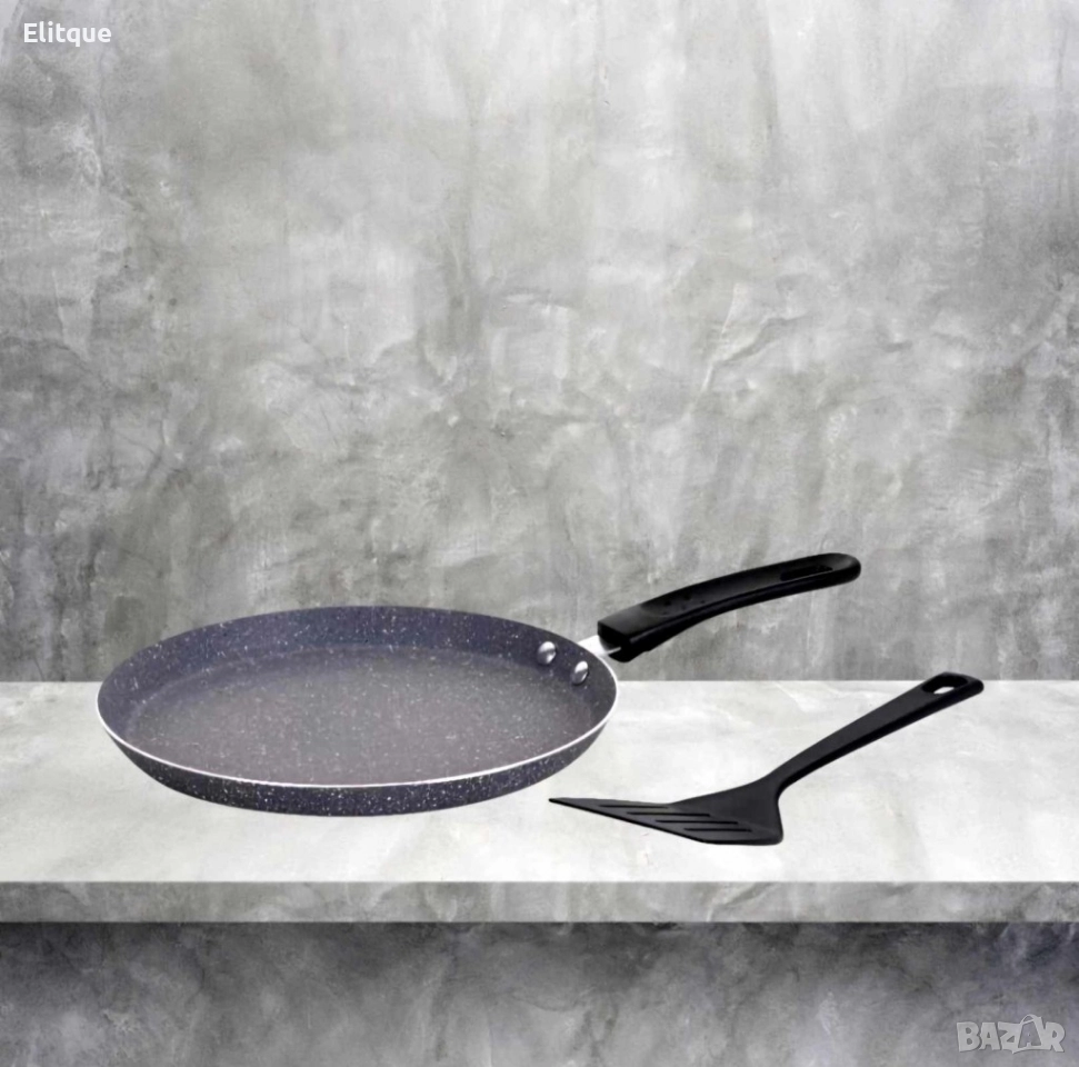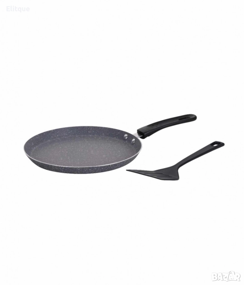 Тиган за палачинки с шпатула. Изработен от висококачествен алуминий. Мраморно незалепващо покритие. Топлоизолирана дръжка за защита на ръцете. Подходящ за широка гама котлони:: газови, халогенни, електрически, стъкло-керамични и индукционни. Идеален за готвене без мазнина и изключително лесен за почистване. Размери диаметър: ᴓ 26 см. х 2 см., ᴓ 24 см. х 2 см.