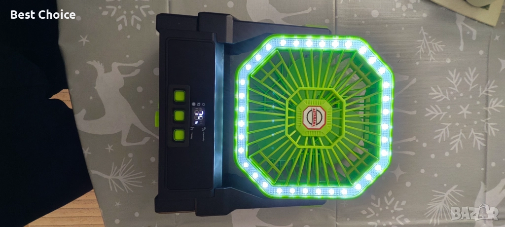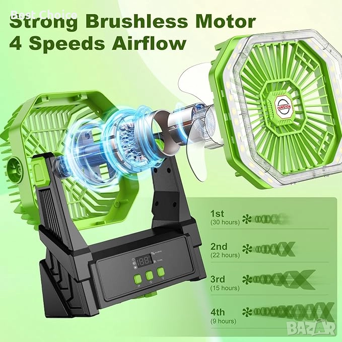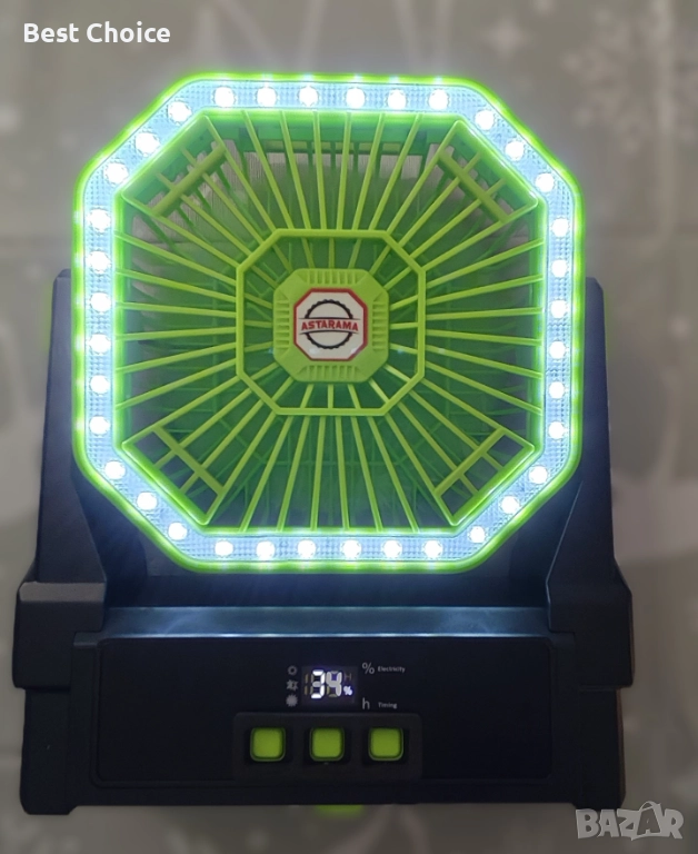 Нов Соларен вентилатор 10000mAh с LED, таймер и кука – за къмпинг двор