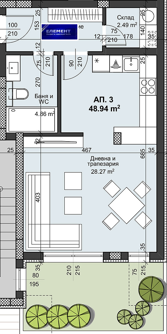 Ап.Б 3 напълно обзаведен ,Едностаен апартамент, луксозно обзаведен по индивидуален проект, със застроена площ от 56,81 м2, с изложение юг; който се състои от преддверие (5.15м2), дневна и трапезария с кухненски бокс (28.27м2), баня и WC (4.86м2) и склад (2.49м2) И ДВОР цена 130120 евро