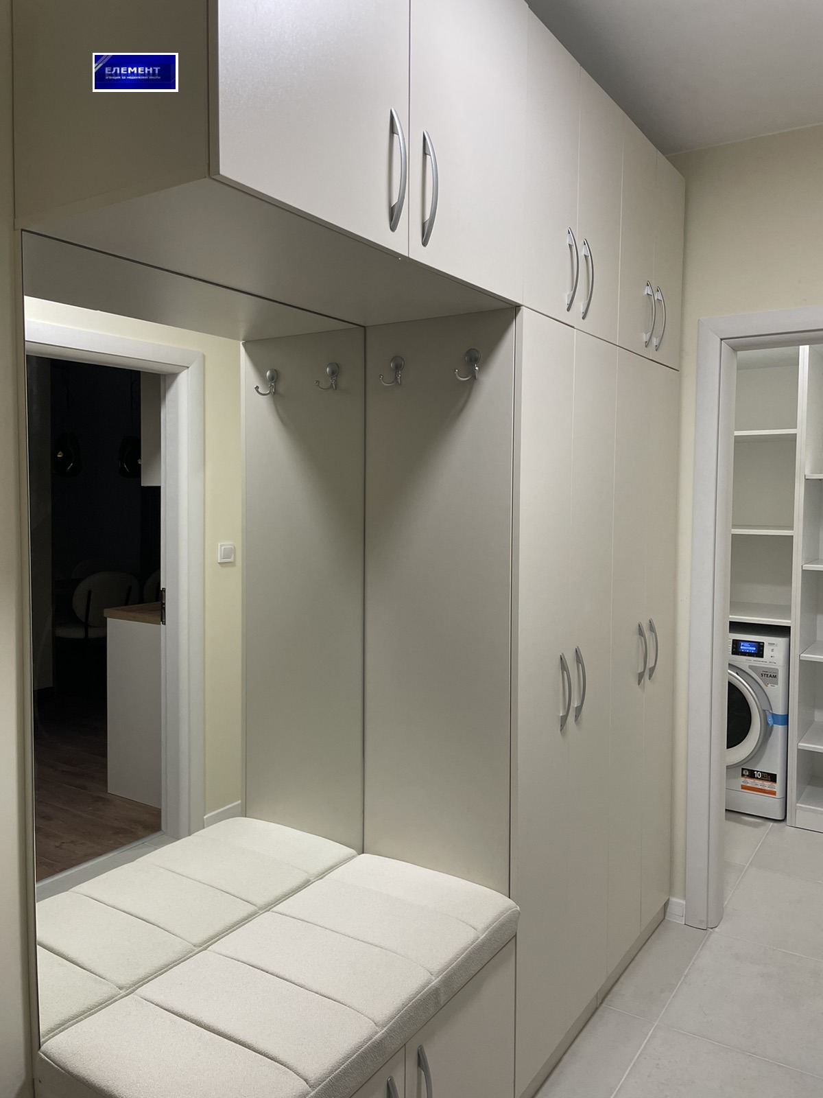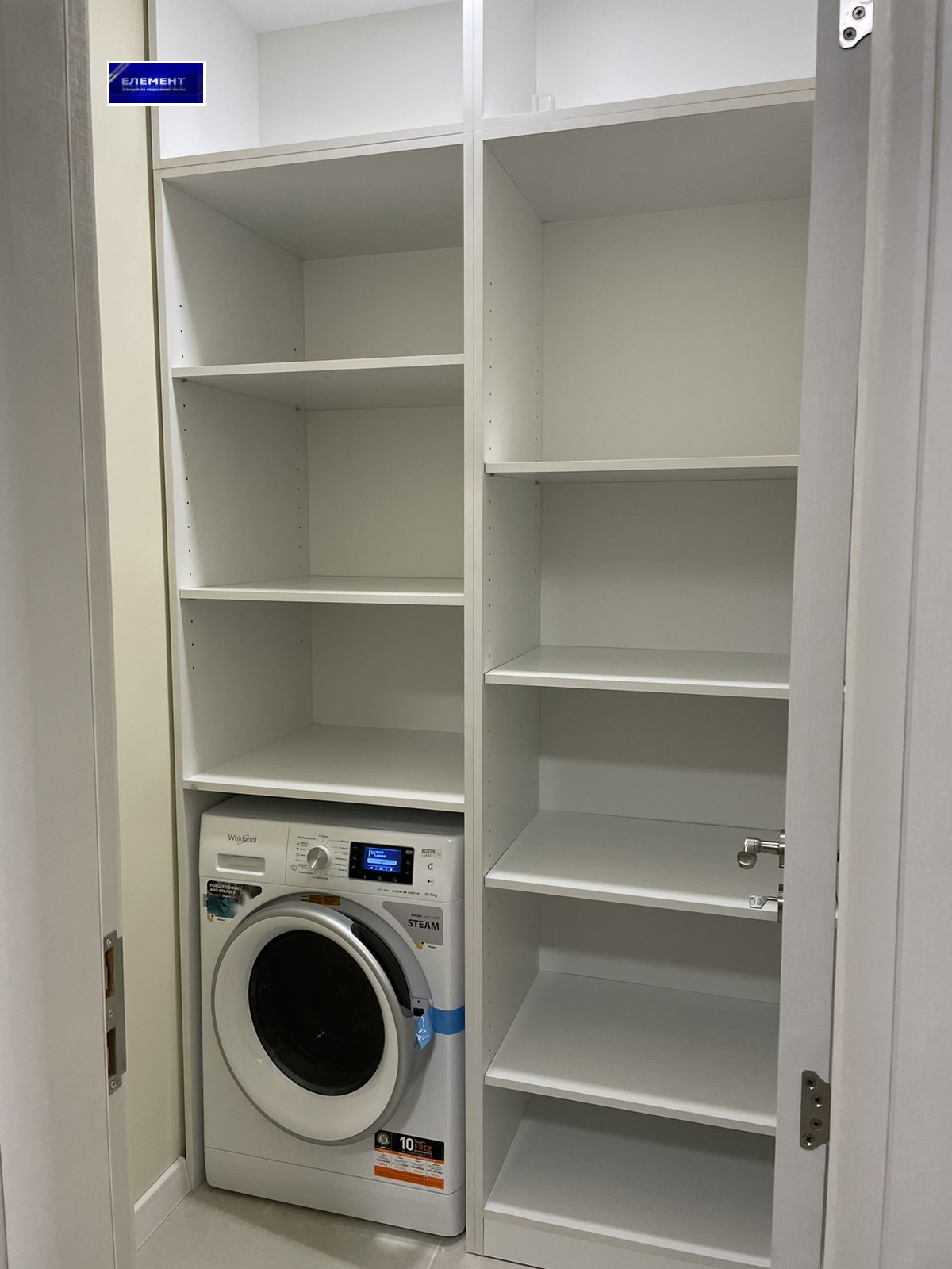 Входното антре има гардероб, а зад плъзгащи врати е прибрана пералня, както и рафтове за складиране на препарати.