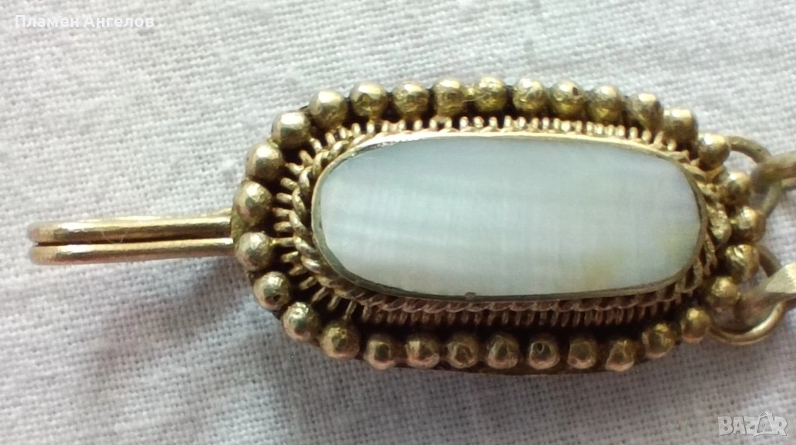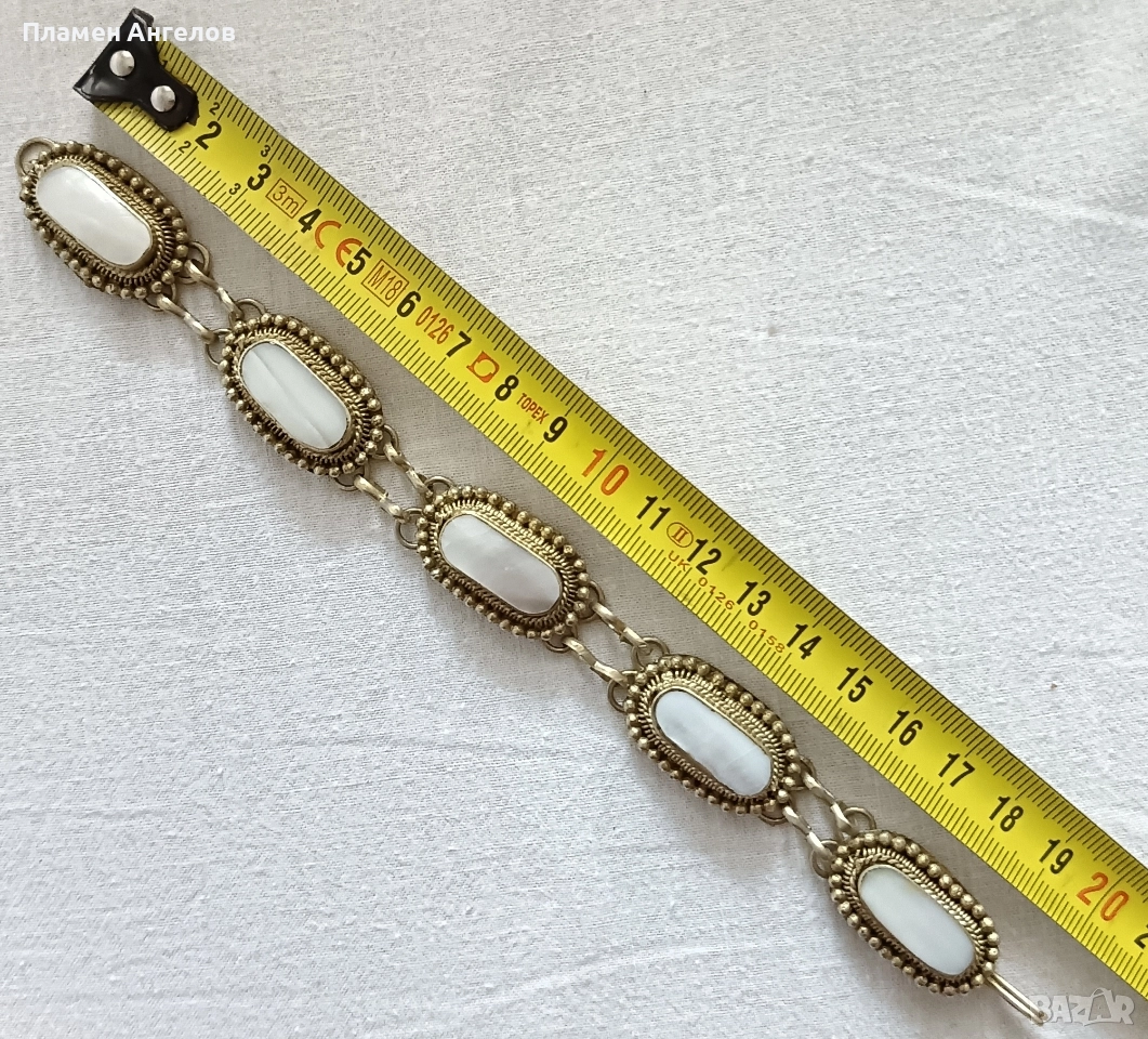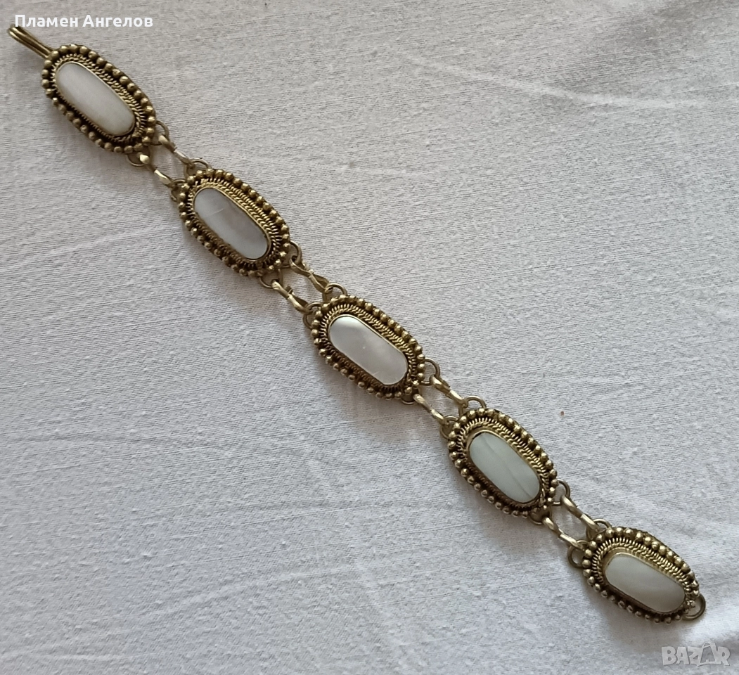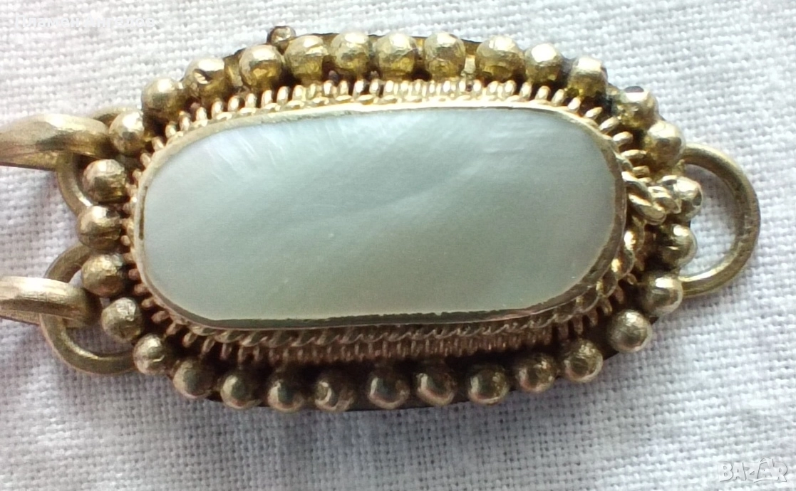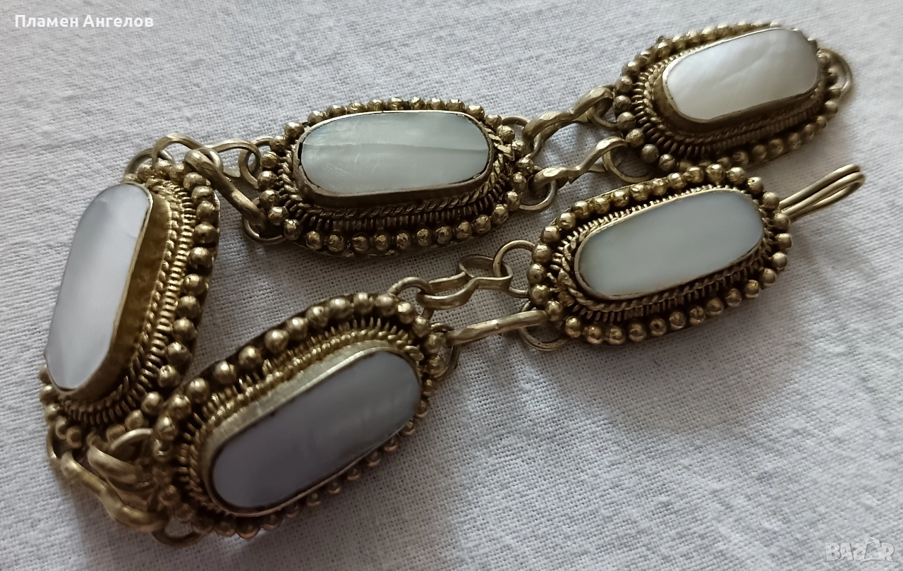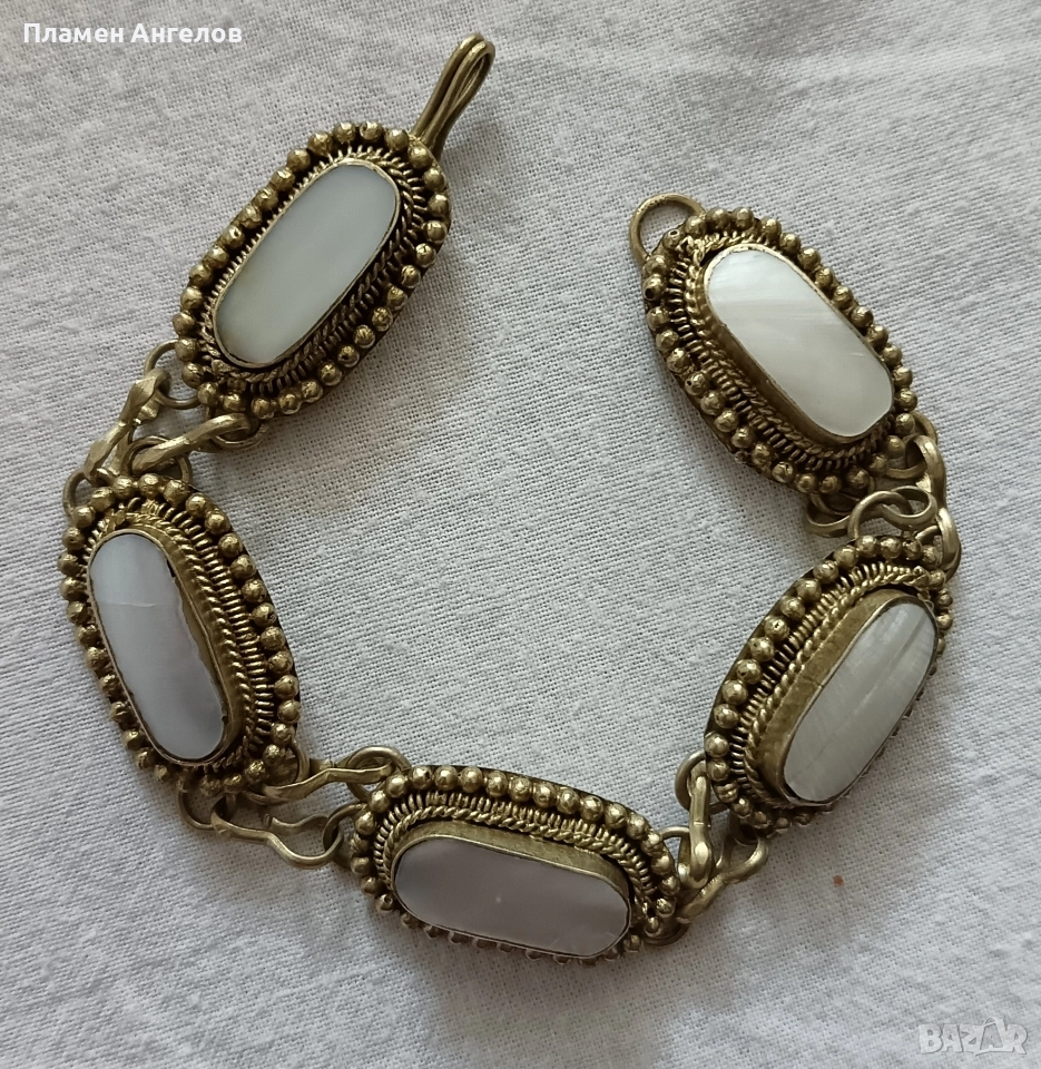Старинна гривна в "етно" или "възрожденски" стил. Ръчно изработена от посребрен бронз (месинг) с инкрустация от бял полиран естествен седеф. Ретро, винтидж гривна с овални форми с ажурни, филигранно елименти. Гривната е в отлично състояние без повреди и липсващи части.