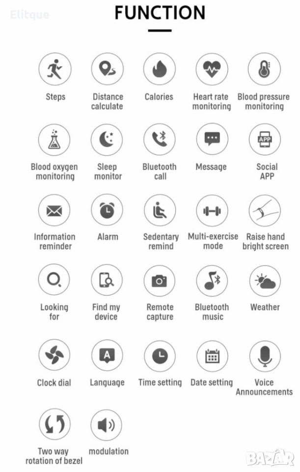 часовник със сензорен екран; Резолюция на екрана: 320x240; Функции: Спортна гривна, монитор на сърдечния ритъм, напомняне за съобщения, измерване на скоростта, дистанционно управление, календар, проследяване на съня, напомняне за повикване, показване на кислород в кръвта, автоматично повикване; Материал на гривната: Силициев гел; Материал на корпуса: Стомана; Камера: Без камера; Материал: Метал + ABS + гума; Вид батерия: Полимерна литиева батерия; Режим на управление: Сензорен екран, управление от мобилно приложение; Размер на екрана: 1,99 инча; Размер на продукта: 44*38*11 мм.; Операционна система: Android5.0+/Ios9.0+. Цвят: черен; Гаранция: 12 месеца.