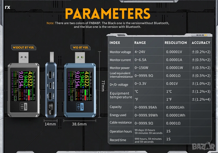 • USB 2.0 интерфейс, 1.44-инчов TFT LCD дисплей с висока разделителна способност с интегрирани USB-A, Micro-USB, Type-C интерфейси, използване на външен 16-битов ADC, физически чип с PD протокол.