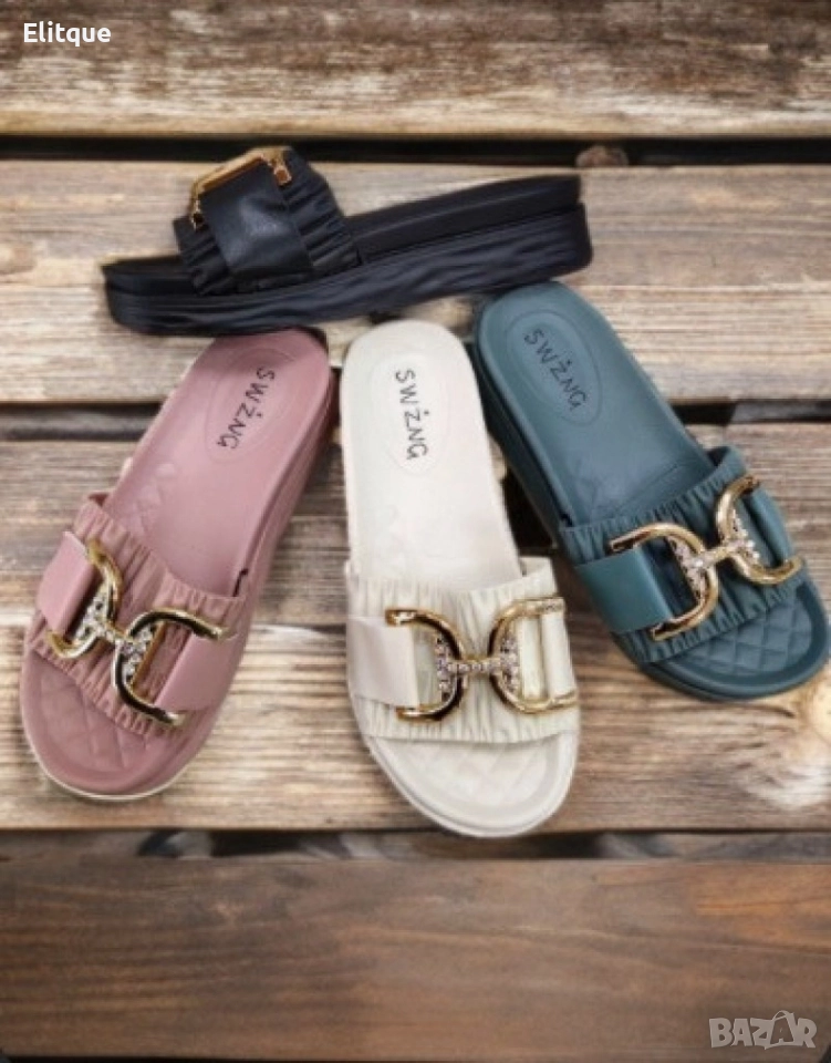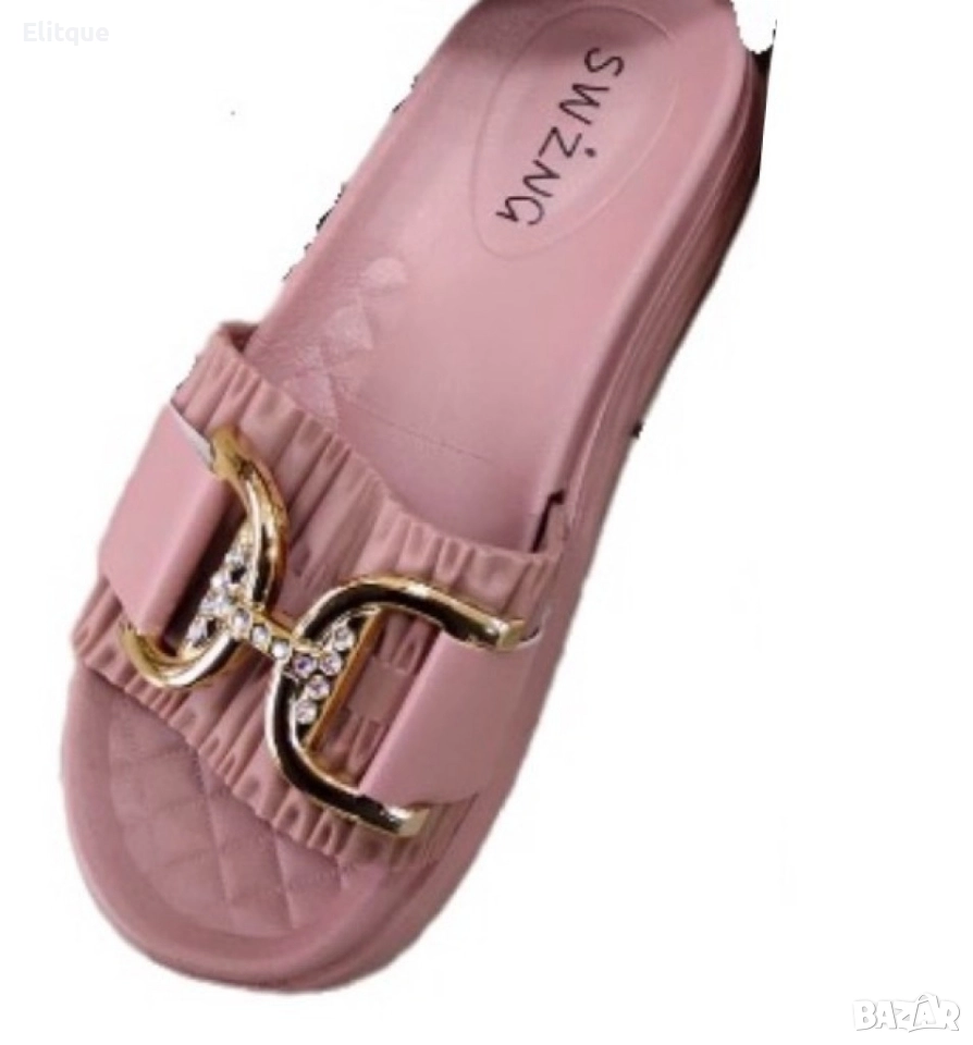 Насладете се на изискаността и разкоша с нашите луксозни дамски чехли, вдъхновени от елегантните златисти елементи. Те са създадени, за да ви предложат не само стил, но и усещане за лукс и изтънченост във всяка стъпка. Преизпълнени със златисти акценти, нашите чехли придават неповторим блясък и изисканост на вашата обувка, правейки ви да се чувствате като истинска дама от високото общество. Изработени от висококачествени материали и с изчистен дизайн, чехлите ви предлагат усещане за лукс и роскош при всяка носена стъпка. С гъвкава подметка и удобни материали, нашите чехли ви осигуряват комфорт и стабилност, докато стъпвате с увереност и елегантност. Размери: 36-41