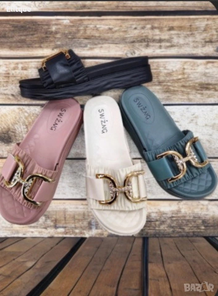 Насладете се на изискаността и разкоша с нашите луксозни дамски чехли, вдъхновени от елегантните златисти елементи. Те са създадени, за да ви предложат не само стил, но и усещане за лукс и изтънченост във всяка стъпка. Преизпълнени със златисти акценти, нашите чехли придават неповторим блясък и изисканост на вашата обувка, правейки ви да се чувствате като истинска дама от високото общество. Изработени от висококачествени материали и с изчистен дизайн, чехлите ви предлагат усещане за лукс и роскош при всяка носена стъпка. С гъвкава подметка и удобни материали, нашите чехли ви осигуряват комфорт и стабилност, докато стъпвате с увереност и елегантност. Размери: 36-41
