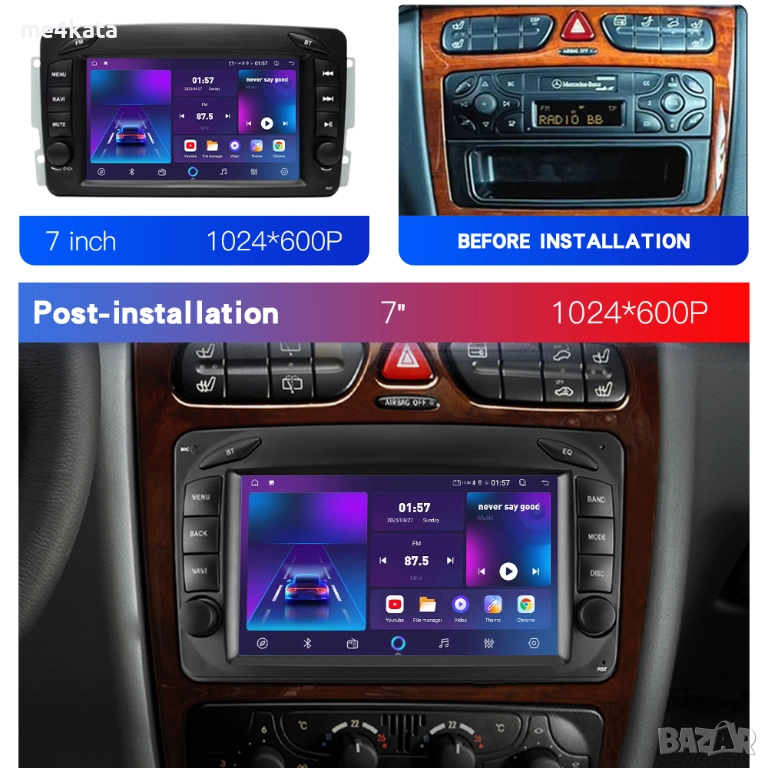 Мултимедията е проектирана специално за Mercedes C-Class / CLK (W168, W209, 2000–2008) и идва с рамка и всички нужни преходни кабели за лесен Plug & Play монтаж без рязане на оригиналната инсталация.