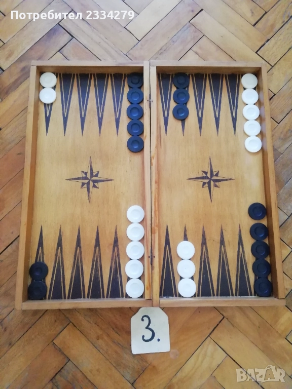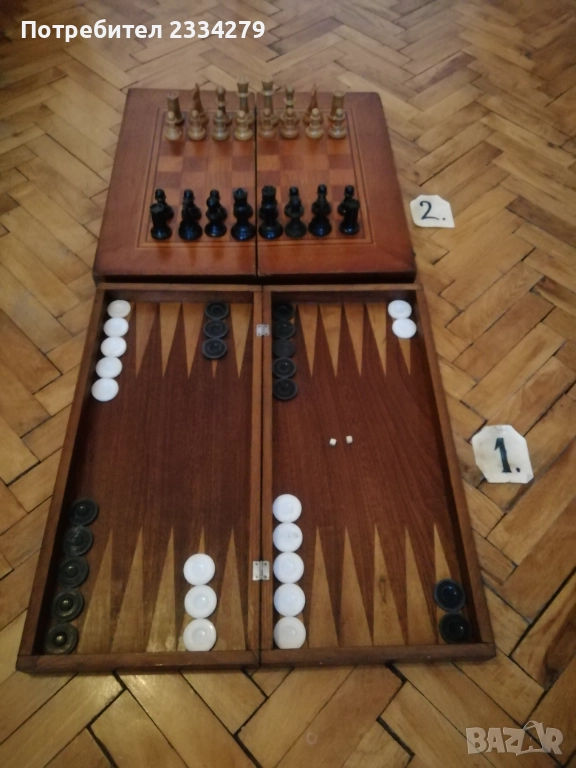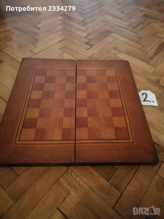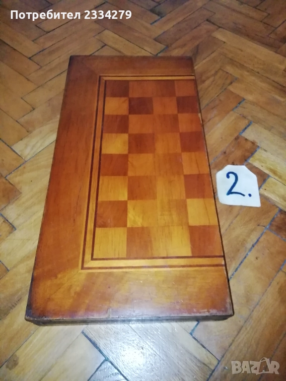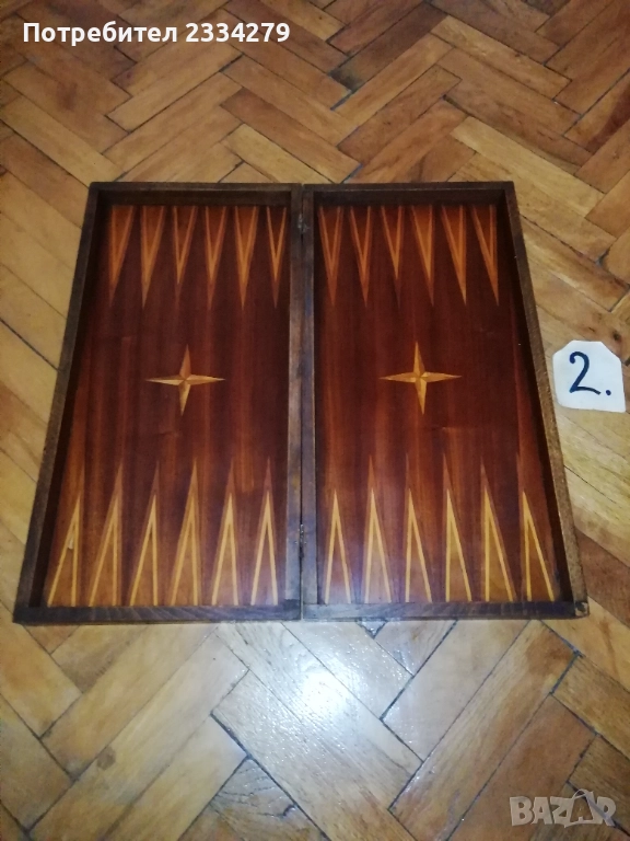 N:1cтара масивна дървена ръчно фурнирана кутия само за табла, добре запазена от 50-те години, голямата версия с размери 50х48см., комплектна с пулове и кокалена зарче та, цена 23€.; N:2 голям стар класически