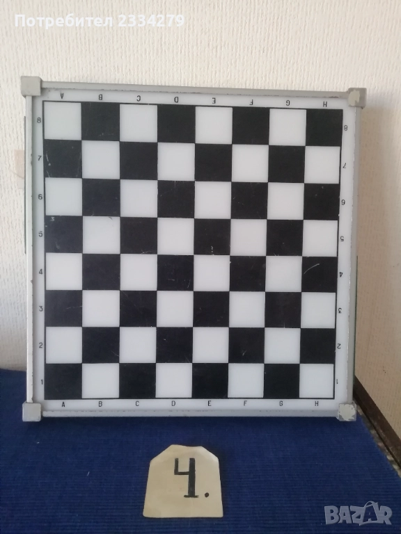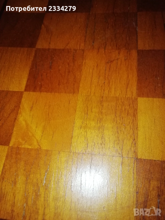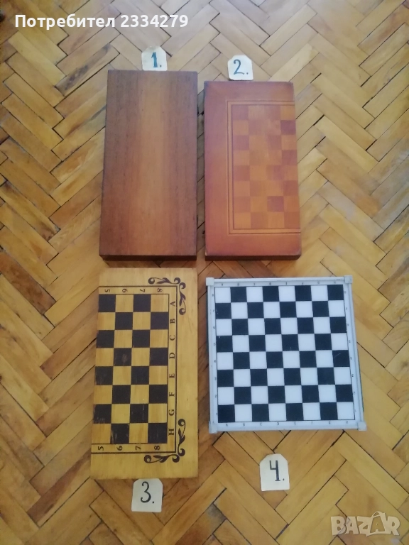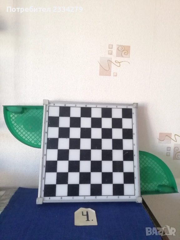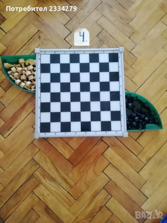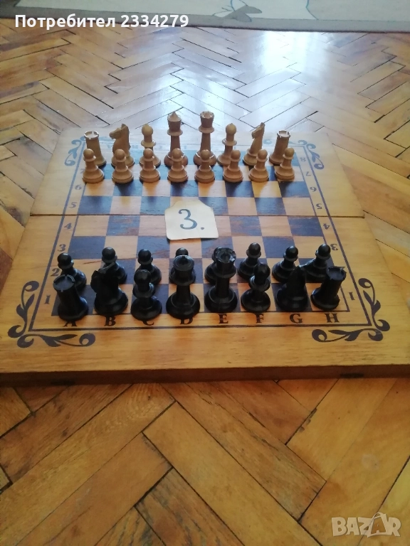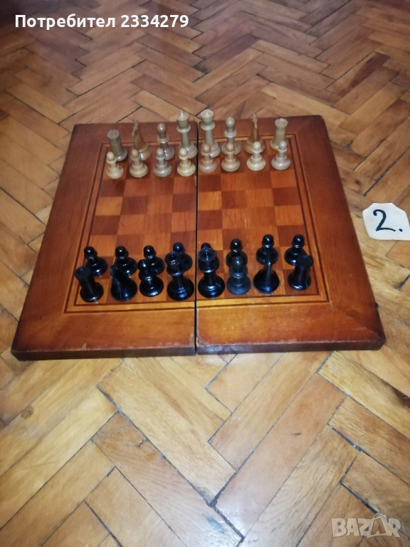 шах и табла в масивна дървена кутия, добро състояние затова че започнато а се играе от 50-те години, комплектна с бакелитови фигури които нямат счупено, размери на кутията разтворена 48х48см., цена 27€.; N:3 игра шах и табла изработена през СОЦА, дървена орнаментирана рисувана кутия с размери дължина 48х48см., дебелина 7см., фигури от бакелит, цена 23€.; N:4 шах от 70-те годините изработен от перциглас с аломиниева рамка, и подвижни джобове за фигурите.,дървени фигури, размери 37х37см., цена 20€.